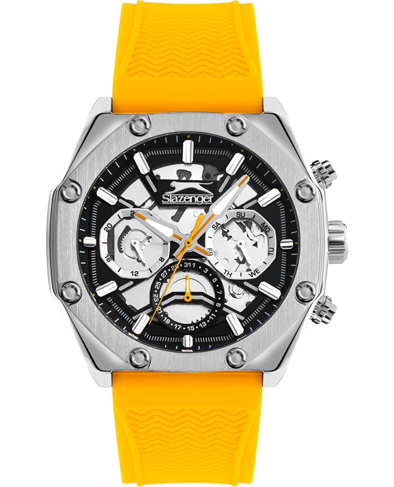 Мужские кварцевые часы Slazenger SL.09.2319.2.06 - это выразительный и функциональный аксессуар, сочетающий стиль, технологичность и насыщенную комплектацию. Корпус выполнен из суперметалла. Циферблат защищён минеральным стекломМинеральное стеклоМинеральное стекло представляет собой искусственно выращенный минерал кварца. Такое стекло отличается особой устойчивостью к повреждениям и царапинам. Уступает по некоторым качествам сапфировому стеклу., частично скелетонизирован, что позволяет наблюдать за работой механизма. Часы оснащены вынесенными малыми циферблатами для индикации дня недели, даты и времени в 24-часовом формате. Стрелки и метки оснащены люминесцентным покрытиемЛюминесцентное покрытиеПозволяет считывать показания времени в темноте. Производители наносят на стрелки, часовые индексы, безель или поверхность циферблата светонакопительный состав, дающий холодное свечение., обеспечивающим хорошую читаемость в темноте. Удобный силиконовый ремешок жёлтого цвета фиксируется на классической пряжке. Водонепроницаемость 50 м позволяет использовать часы в повседневных условиях, защищая от случайных брызг и капель дождя. Модель подчёркивает индивидуальность владельца и идеально подходит как для повседневного, так и для спортивного образа.