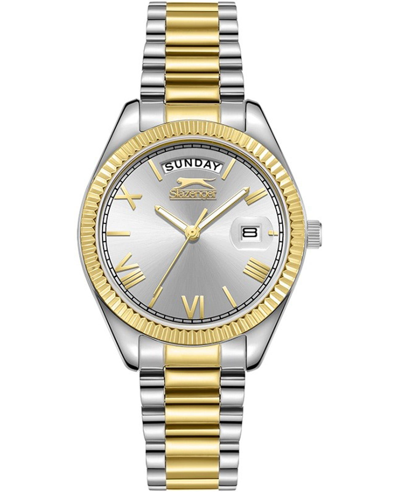 Женские элегантные наручные часы Slazenger SL.09.2338.4.04 сочетают в себе современный стиль и функциональность. Стильный корпус выполнен из суперметалла, а неповоротный безельБезельВнешний ободок, закрепляющий стекло. В спортивных часах так называется поворотное кольцо с делениями на циферблате, выполняет роль таймера – замеряет отрезки времени на шкале. Неподвижный безель – элемент декора. Однонаправленно вращающийся безель на дайверских часах позволяет фиксировать моменты погружения и выныривания на поверхность. с IP-покрытиемIP-покрытиеМетод ионного напыления. Демонстрирует повышенную устойчивость к истиранию, окислению и химическим веществам. Под воздействием высокого давления и температуры около 1500°C молекулы металла надёжно соединяются с частицами корпуса часов., придающий модели дополнительную прочность и элегантный внешний вид. Изысканный циферблат защищён минеральным стекломМинеральное стеклоМинеральное стекло представляет собой искусственно выращенный минерал кварца. Такое стекло отличается особой устойчивостью к повреждениям и царапинам. Уступает по некоторым качествам сапфировому стеклу., устойчивым к царапинам и повреждениям. Водонепроницаемость 3 АТМ позволяет использовать часы в повседневных условиях — при мытье рук или под лёгким дождём. Браслет из суперметалла с частичным IP-покрытиемIP-покрытиеМетод ионного напыления. Демонстрирует повышенную устойчивость к истиранию, окислению и химическим веществам. Под воздействием высокого давления и температуры около 1500°C молекулы металла надёжно соединяются с частицами корпуса часов. и с раскладной застёжкойРаскладная застёжкаТакой тип застёжки используется только на браслетах из металла. Она никогда не раскрывается полностью, происходит разделение на 2 и более частей. Раскладывающая застёжка снизит вероятность потери часов к минимуму., обеспечивающий надёжную фиксацию и комфорт при ношении. Окошко даты находится в положении 3 часа. Cтрелки покрыты люминесцентным покрытиемЛюминесцентное покрытиеПозволяет считывать показания времени в темноте. Производители наносят на стрелки, часовые индексы, безель или поверхность циферблата светонакопительный состав, дающий холодное свечение. для читаемости в условиях недостаточного освещения. Эта модель идеально подходит для женщин, ценящих стиль, функциональность и надёжность в одном аксессуаре.