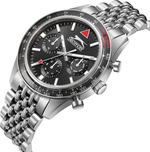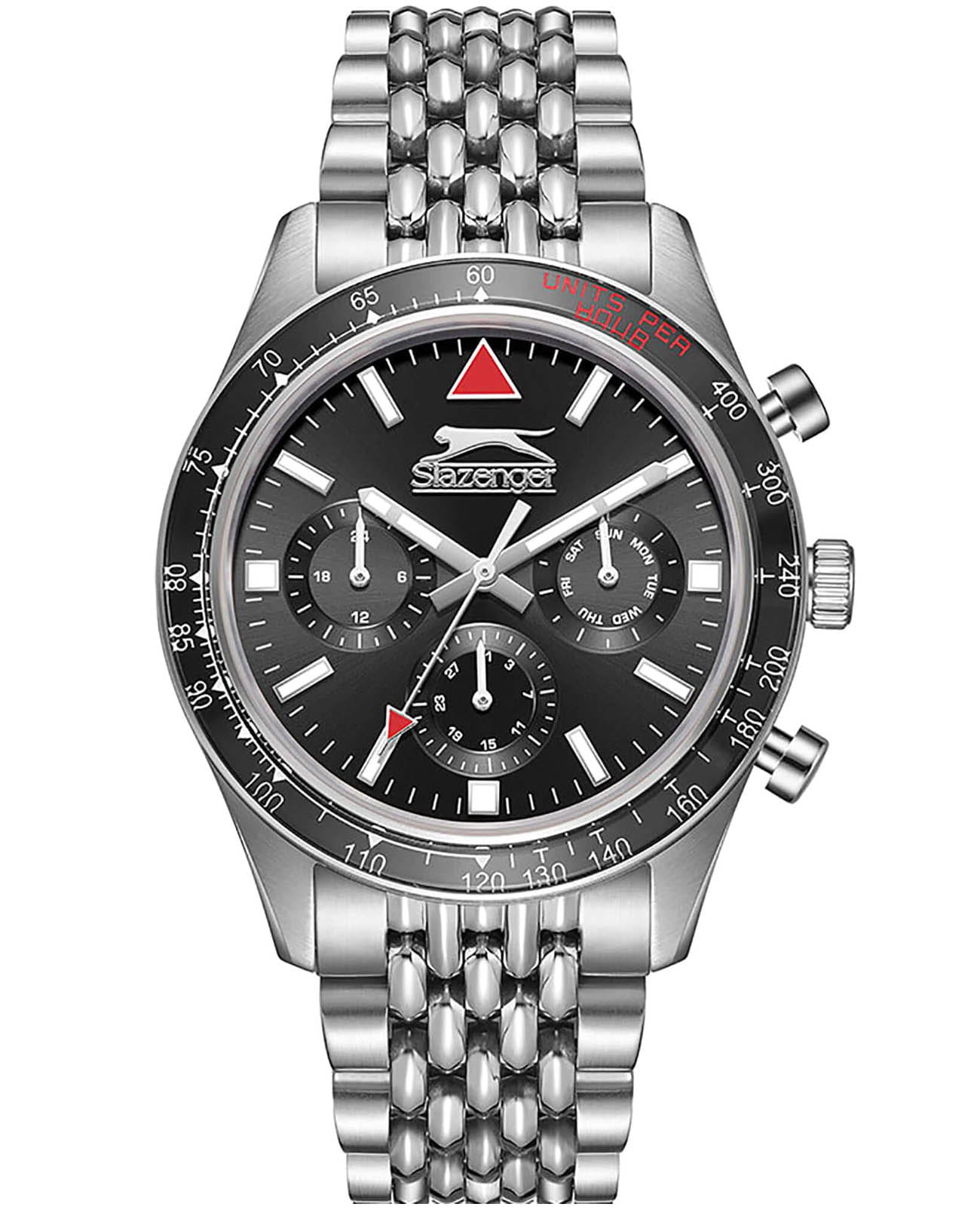 Мужские кварцевые часы Slazenger SL.09.2360.2.01 – идеальное сочетание классического дизайна и современных технологий, созданное для уверенных в себе мужчин. Корпус выполнен из суперметалла серебристого цвета, диаметром 43 мм и толщиной 12 мм, подчёркивает надежность модели и делает их идеальным аксессуаром для любой ситуации – будь то деловая встреча или повседневные выходы. Циферблат надёжно защищён минеральным стекломМинеральное стеклоМинеральное стекло представляет собой искусственно выращенный минерал кварца. Такое стекло отличается особой устойчивостью к повреждениям и царапинам. Уступает по некоторым качествам сапфировому стеклу., которое устойчиво к механическим повреждениям и сохраняет кристальную прозрачность. Неподвижный безельБезельВнешний ободок, закрепляющий стекло. В спортивных часах так называется поворотное кольцо с делениями на циферблате, выполняет роль таймера – замеряет отрезки времени на шкале. Неподвижный безель – элемент декора. Однонаправленно вращающийся безель на дайверских часах позволяет фиксировать моменты погружения и выныривания на поверхность. с IP-покрытиемIP-покрытиеМетод ионного напыления. Демонстрирует повышенную устойчивость к истиранию, окислению и химическим веществам. Под воздействием высокого давления и температуры около 1500°C молекулы металла надёжно соединяются с частицами корпуса часов. черного цвета. Стальной браслет на раскладной застёжкеРаскладная застёжкаТакой тип застёжки используется только на браслетах из металла. Она никогда не раскрывается полностью, происходит разделение на 2 и более частей. Раскладывающая застёжка снизит вероятность потери часов к минимуму. удобно облегает запястье, обеспечивая надёжность и комфорт в повседневном ношении. Стрелки и метки покрыты люминесцентным покрытиемЛюминесцентное покрытиеПозволяет считывать показания времени в темноте. Производители наносят на стрелки, часовые индексы, безель или поверхность циферблата светонакопительный состав, дающий холодное свечение., обеспечивающим отличную читаемость в темноте. Эти часы станут не просто аксессуаром, а надежным спутником в любой ситуации, подчеркивая ваш безупречный вкус и деловой стиль. Вынесенный циферблат с 24-х часовым указателем времени и функция тахиметраТахиметрРазмеченная шкала, располагается на ободке или безеле часов. Тахиметр позволяет рассчитать скорость на определённом участке пути, расстояние измеряется в километрах или милях.. Водозащита 50 метров позволит защитить корпус от случайных брызг или капель дождя.