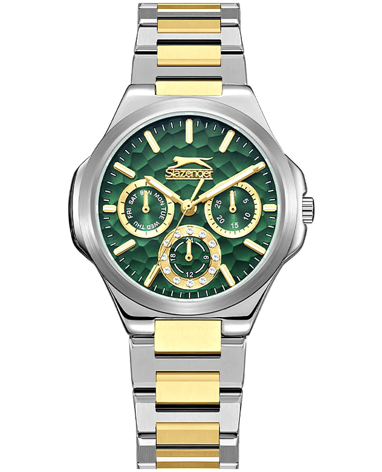 Женские кварцевые часы Slazenger SL.09.2365.4.01 – это сочетание элегантности, современного стиля и надёжности. Изящный корпус из суперметалла серебристого цвета, диаметром 33 мм и толщиной 10 мм, подчёркивает утончённость модели и делает их идеальным аксессуаром для любой ситуации – будь то деловая встреча, романтический вечер или повседневные выходы. Циферблат надёжно защищён минеральным стекломМинеральное стеклоМинеральное стекло представляет собой искусственно выращенный минерал кварца. Такое стекло отличается особой устойчивостью к повреждениям и царапинам. Уступает по некоторым качествам сапфировому стеклу., которое устойчиво к механическим повреждениям и сохраняет кристальную прозрачность. Браслет из суперметалла с частичным IP-покрытиемIP-покрытиеМетод ионного напыления. Демонстрирует повышенную устойчивость к истиранию, окислению и химическим веществам. Под воздействием высокого давления и температуры около 1500°C молекулы металла надёжно соединяются с частицами корпуса часов. золотистого цвета удобно облегает запястье и фиксируется с помощью раскладной застёжкиРаскладная застёжкаТакой тип застёжки используется только на браслетах из металла. Она никогда не раскрывается полностью, происходит разделение на 2 и более частей. Раскладывающая застёжка снизит вероятность потери часов к минимуму., обеспечивая надёжность и комфорт в повседневном ношении. Утончённый стиль, внимание к деталям и практичность делают эту модель идеальным выбором для современных женщин, ценящих эстетику и функциональность. Стрелки и метки покрыты люминесцентным покрытиемЛюминесцентное покрытиеПозволяет считывать показания времени в темноте. Производители наносят на стрелки, часовые индексы, безель или поверхность циферблата светонакопительный состав, дающий холодное свечение., обеспечивающим отличную читаемость в темноте. Вынесенный циферблат с 24-х часовым указателем времени украшен фианитами. Водозащита до 30 метров позволит защитить корпус от случайных брызг или капель дождя.
