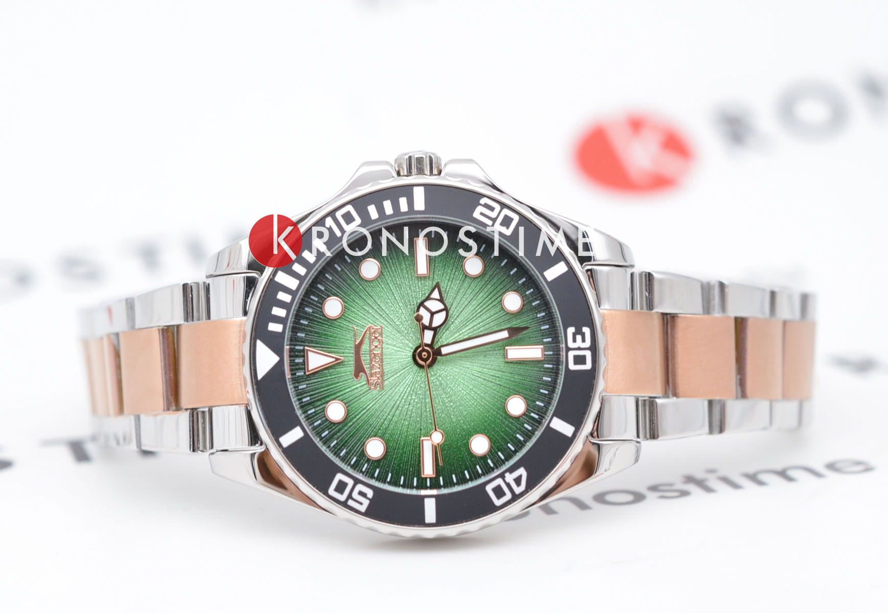 Женские кварцевые часы Slazenger — это элегантный аксессуар. Корпус диаметром 33 мм и толщиной 9 мм выполнен из суперметалла. Безель с IP-покрытиемIP-покрытиеМетод ионного напыления. Демонстрирует повышенную устойчивость к истиранию, окислению и химическим веществам. Под воздействием высокого давления и температуры около 1500°C молекулы металла надёжно соединяются с частицами корпуса часов.. Циферблат зелёного цвета оформлен индексами и стрелками. Циферблат защищён минеральным стекломМинеральное стеклоМинеральное стекло представляет собой искусственно выращенный минерал кварца. Такое стекло отличается особой устойчивостью к повреждениям и царапинам. Уступает по некоторым качествам сапфировому стеклу.. Механизм — кварцевый. Стрелки и метки с люминесцентным покрытиемЛюминесцентное покрытиеПозволяет считывать показания времени в темноте. Производители наносят на стрелки, часовые индексы, безель или поверхность циферблата светонакопительный состав, дающий холодное свечение., обеспечивающим хорошую читаемость в темноте. Часы оснащены браслетом из суперметалла с IP-покрытиемIP-покрытиеМетод ионного напыления. Демонстрирует повышенную устойчивость к истиранию, окислению и химическим веществам. Под воздействием высокого давления и температуры около 1500°C молекулы металла надёжно соединяются с частицами корпуса часов. и раскладной застёжкойРаскладная застёжкаТакой тип застёжки используется только на браслетах из металла. Она никогда не раскрывается полностью, происходит разделение на 2 и более частей. Раскладывающая застёжка снизит вероятность потери часов к минимуму.. Водонепроницаемость 50 м позволяет использовать часы в повседневных условиях. Гарантия — 12 месяцев. Идеальный выбор для тех, кто ценит стиль и качество.
