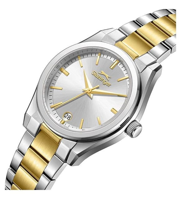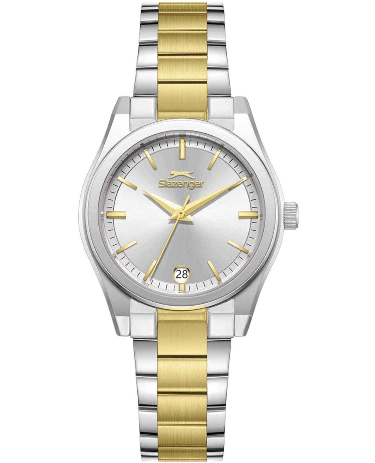Женские кварцевые часы Slazenger — это элегантный аксессуар. Корпус диаметром 32 мм и толщиной 8 мм выполнен из суперметалла. Циферблат серебристого цвета оформлен индексами и стрелками. Циферблат защищён минеральным стекломМинеральное стеклоМинеральное стекло представляет собой искусственно выращенный минерал кварца. Такое стекло отличается особой устойчивостью к повреждениям и царапинам. Уступает по некоторым качествам сапфировому стеклу.. Механизм — кварцевый. Окошко даты расположено в положении 6 часов. Часы оснащены браслетом из суперметалла с IP-покрытиемIP-покрытиеМетод ионного напыления. Демонстрирует повышенную устойчивость к истиранию, окислению и химическим веществам. Под воздействием высокого давления и температуры около 1500°C молекулы металла надёжно соединяются с частицами корпуса часов. на застёжке «бабочка» с кнопкамиЗастёжка "бабочка"Такой вид застёжки дополняется предохранителями, помогающими избежать случайного раскрытия браслета. Обладают изящным исполнением. . Водонепроницаемость 50 м позволяет использовать часы в повседневных условиях. Гарантия — 12 месяцев. Идеальный выбор для тех, кто ценит стиль и качество.