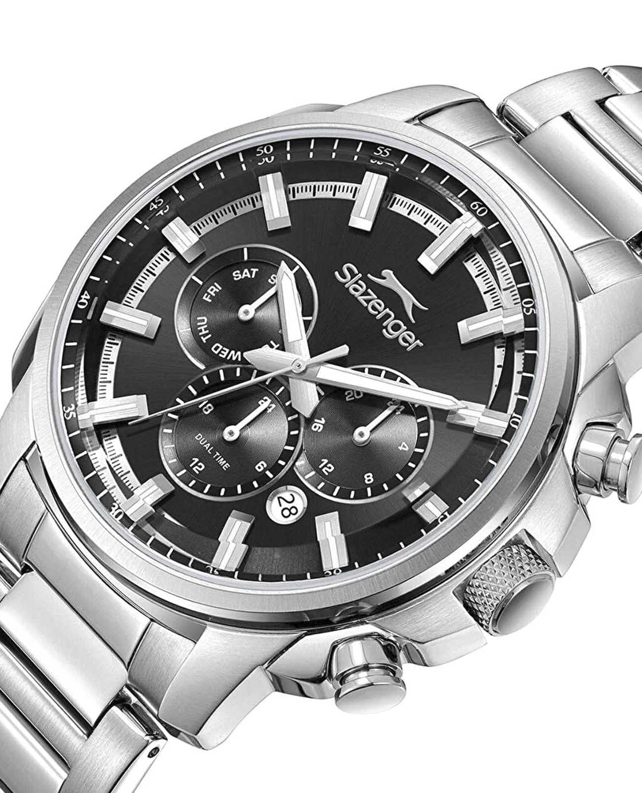 Мужские кварцевые часы Slazenger — это выразительный и функциональный аксессуар. Корпус диаметром 43 мм и толщиной 13,5 мм выполнен из нержавеющей стали 316L. Циферблат чёрного цвета оформлен индексами и стрелками. Циферблат защищён минеральным стекломМинеральное стеклоМинеральное стекло представляет собой искусственно выращенный минерал кварца. Такое стекло отличается особой устойчивостью к повреждениям и царапинам. Уступает по некоторым качествам сапфировому стеклу.. Механизм — кварцевый. Часы оснащены индикацией дня недели, даты, 12/24-часового формата времени и функцией второго часового пояса (GMT)Второй часовой поясФункция, позволяющая отображать время двух часовых поясов одновременно.. Окошко даты расположено между 4 и 5 часами. Часы оснащены стальным браслетом с раскладной застёжкойРаскладная застёжкаТакой тип застёжки используется только на браслетах из металла. Она никогда не раскрывается полностью, происходит разделение на 2 и более частей. Раскладывающая застёжка снизит вероятность потери часов к минимуму.. Водонепроницаемость 100 м позволяет использовать часы для плавания и повседневного ношения. Гарантия — 12 месяцев. Идеальный выбор для тех, кто ценит стиль, функциональность и качество.