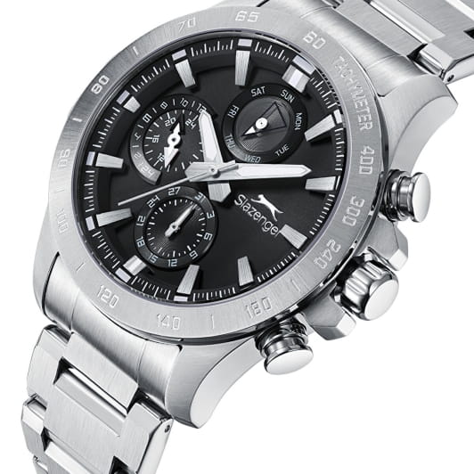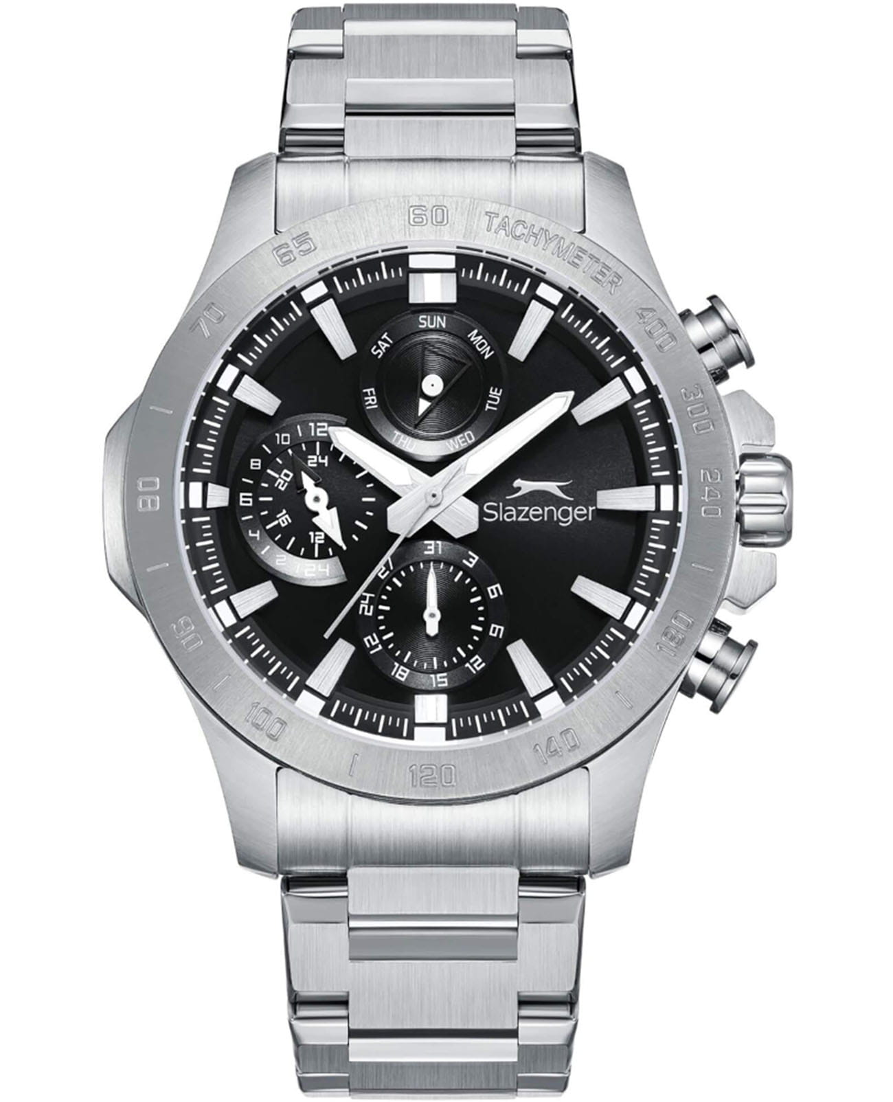 Мужские кварцевые часы Slazenger — это выразительный и функциональный аксессуар. Корпус диаметром 44 мм и толщиной 12 мм выполнен из нержавеющей стали 316L. Циферблат чёрного цвета оформлен индексами и стрелками. Циферблат защищён минеральным стекломМинеральное стеклоМинеральное стекло представляет собой искусственно выращенный минерал кварца. Такое стекло отличается особой устойчивостью к повреждениям и царапинам. Уступает по некоторым качествам сапфировому стеклу.. Механизм — кварцевый. Часы оснащены индикацией дня недели, даты и 12/24-часового формата времени. Стрелки и метки с люминесцентным покрытиемЛюминесцентное покрытиеПозволяет считывать показания времени в темноте. Производители наносят на стрелки, часовые индексы, безель или поверхность циферблата светонакопительный состав, дающий холодное свечение., обеспечивающим хорошую читаемость в темноте. Часы оснащены стальным браслетом с раскладной застёжкойРаскладная застёжкаТакой тип застёжки используется только на браслетах из металла. Она никогда не раскрывается полностью, происходит разделение на 2 и более частей. Раскладывающая застёжка снизит вероятность потери часов к минимуму.. Водонепроницаемость 100 м позволяет использовать часы для плавания и повседневного ношения. Гарантия — 12 месяцев. Идеальный выбор для тех, кто ценит стиль, функциональность и качество.