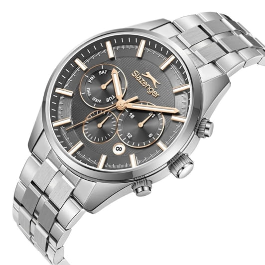 Мужские кварцевые часы Slazenger — это выразительный и функциональный аксессуар. Корпус диаметром 43 мм и толщиной 13 мм выполнен из нержавеющей стали 316L. Циферблат серого цвета оформлен индексами и стрелками. Циферблат защищён минеральным стекломМинеральное стеклоМинеральное стекло представляет собой искусственно выращенный минерал кварца. Такое стекло отличается особой устойчивостью к повреждениям и царапинам. Уступает по некоторым качествам сапфировому стеклу.. Механизм — кварцевый. Часы оснащены индикацией дня недели, даты, 12/24-часового формата времени и функцией второго часового пояса (GMT)Второй часовой поясФункция, позволяющая отображать время двух часовых поясов одновременно.. Окошко даты расположено между 4 и 5 часами. Стрелки и метки с люминесцентным покрытиемЛюминесцентное покрытиеПозволяет считывать показания времени в темноте. Производители наносят на стрелки, часовые индексы, безель или поверхность циферблата светонакопительный состав, дающий холодное свечение., обеспечивающим хорошую читаемость в темноте. Часы оснащены стальным браслетом с раскладной застёжкойРаскладная застёжкаТакой тип застёжки используется только на браслетах из металла. Она никогда не раскрывается полностью, происходит разделение на 2 и более частей. Раскладывающая застёжка снизит вероятность потери часов к минимуму.. Водонепроницаемость 100 м позволяет использовать часы для плавания и повседневного ношения. Гарантия — 12 месяцев. Идеальный выбор для тех, кто ценит стиль, функциональность и качество.