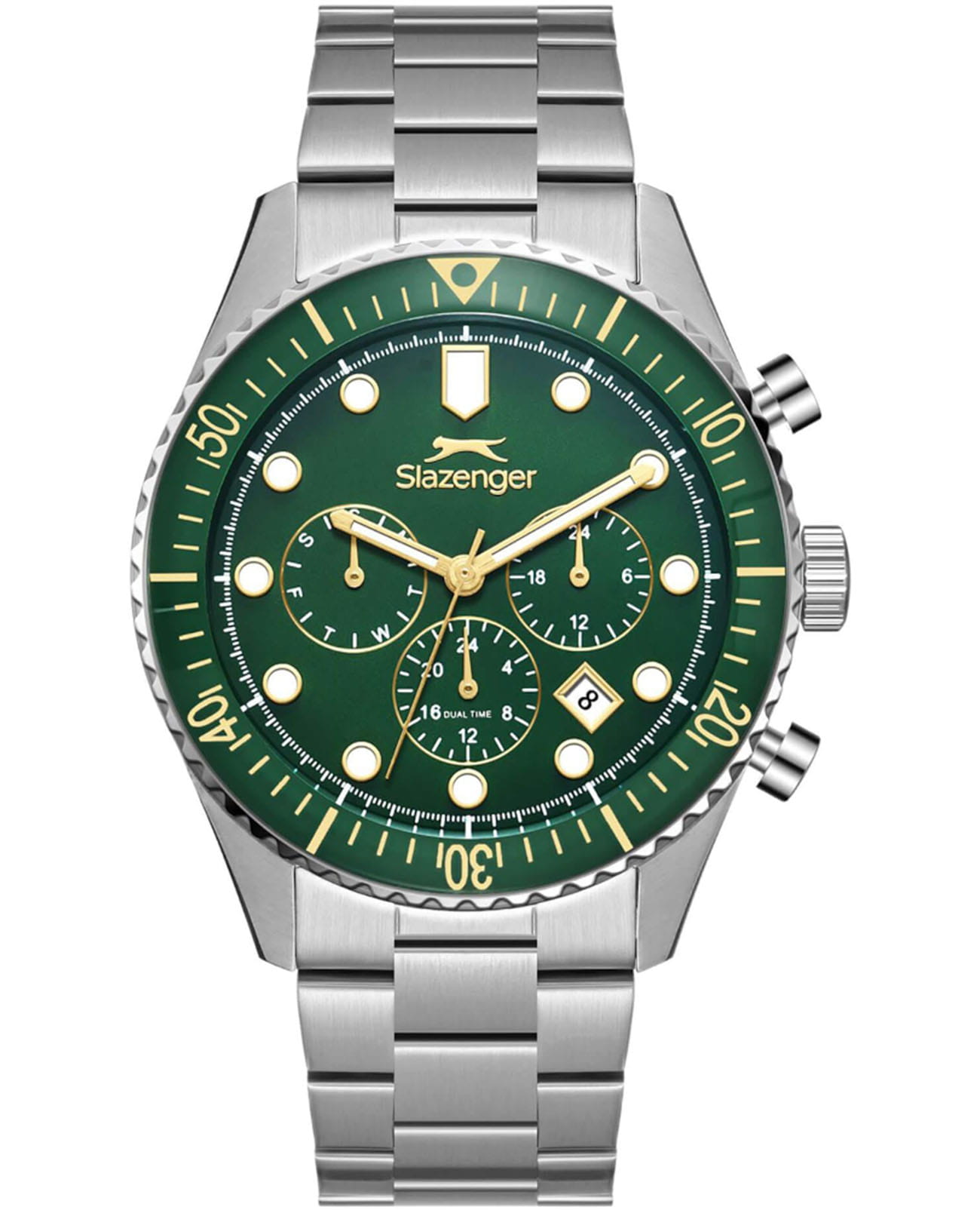 Мужские кварцевые часы Slazenger — это выразительный и функциональный аксессуар. Корпус диаметром 43 мм и толщиной 12 мм выполнен из нержавеющей стали 316L. Циферблат зелёного цвета оформлен индексами и стрелками. Циферблат защищён минеральным стекломМинеральное стеклоМинеральное стекло представляет собой искусственно выращенный минерал кварца. Такое стекло отличается особой устойчивостью к повреждениям и царапинам. Уступает по некоторым качествам сапфировому стеклу.. Механизм — кварцевый. Часы оснащены индикацией дня недели, даты, 12/24-часового формата времени и функцией второго часового пояса (GMT)Второй часовой поясФункция, позволяющая отображать время двух часовых поясов одновременно.. Окошко даты расположено между 4 и 5 часами. Стрелки и метки с люминесцентным покрытиемЛюминесцентное покрытиеПозволяет считывать показания времени в темноте. Производители наносят на стрелки, часовые индексы, безель или поверхность циферблата светонакопительный состав, дающий холодное свечение., обеспечивающим хорошую читаемость в темноте. БезельБезельВнешний ободок, закрепляющий стекло. В спортивных часах так называется поворотное кольцо с делениями на циферблате, выполняет роль таймера – замеряет отрезки времени на шкале. Неподвижный безель – элемент декора. Однонаправленно вращающийся безель на дайверских часах позволяет фиксировать моменты погружения и выныривания на поверхность. с IP-покрытиемIP-покрытиеМетод ионного напыления. Демонстрирует повышенную устойчивость к истиранию, окислению и химическим веществам. Под воздействием высокого давления и температуры около 1500°C молекулы металла надёжно соединяются с частицами корпуса часов.. Часы оснащены стальным браслетом с раскладной застёжкойРаскладная застёжкаТакой тип застёжки используется только на браслетах из металла. Она никогда не раскрывается полностью, происходит разделение на 2 и более частей. Раскладывающая застёжка снизит вероятность потери часов к минимуму.. Водонепроницаемость 100 м позволяет использовать часы для плавания и повседневного ношения. Гарантия — 12 месяцев. Идеальный выбор для тех, кто ценит стиль, функциональность и качество.