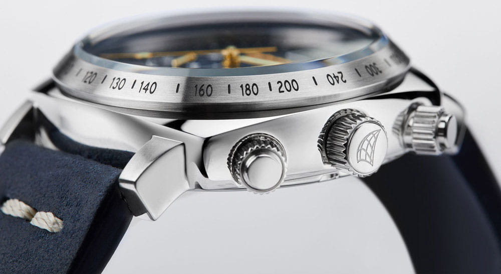 Мужской кварцевый хронографХронографФункция позволяет измерять отрезки времени с особой точностью: часы, минуты, секунды. Верным признаком хронографа является наличие на циферблате 3 дополнительных окошек-счётчиков. с секундомеромСекундомерСекундоме́р — прибор, способный измерять интервалы времени с точностью до долей секунды. и тахиметромТахиметрРазмеченная шкала, располагается на ободке или безеле часов. Тахиметр позволяет рассчитать скорость на определённом участке пути, расстояние измеряется в километрах или милях. Spinnaker Hull SP-5068-03. Калибр механизма TMI VK73. Центральные часовая и минутная стрелки, секундная стрелка вынесена на малый циферблат. Большая дата в позиции 12 часов. 12/24х часовой формат времени. Корпус выполнен из нержавеющей стали. Кожаный ремешок шириной 22 мм, стандартная застежка. Циферблат с люминесцентным покрытиемЛюминесцентное покрытиеПозволяет считывать показания времени в темноте. Производители наносят на стрелки, часовые индексы, безель или поверхность циферблата светонакопительный состав, дающий холодное свечение. стрелок и меток, дополнен выпуклым минеральным стекломМинеральное стеклоМинеральное стекло представляет собой искусственно выращенный минерал кварца. Такое стекло отличается особой устойчивостью к повреждениям и царапинам. Уступает по некоторым качествам сапфировому стеклу. , устойчивым к мелким механическим повреждениям. Водостойкость WR 100 (плавание без погружения).