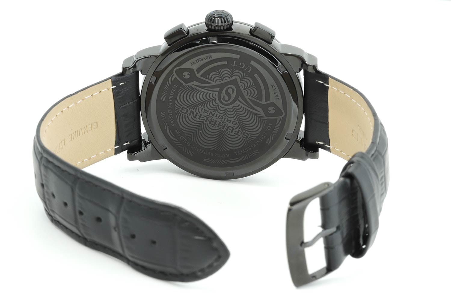Stuhrling 392.03 — мощные мужские часы с выразительным индустриальным дизайном и технологичной эстетикой. Матовый корпус с PVD-покрытиемPVDУльтратонкое покрытие наносится в технике вакуумного напыления, сочетает в себе нитрид титана особой прочности со слоем золота или оксида хрома. Несёт в себе декоративную или защитную функцию. подчёркивает брутальный характер модели, а многослойный циферблат с тремя счётчиками хронографаХронографФункция позволяет измерять отрезки времени с особой точностью: часы, минуты, секунды. Верным признаком хронографа является наличие на циферблате 3 дополнительных окошек-счётчиков. и крупным окном даты создаёт эффект глубины и механической сложности. Контрастные стрелки и метки обеспечивают превосходную читаемость. Прочное стекло KrysternaKrysternaKrysterna — инновационное стекло для наручных часов. Благодаря уникальной структуре, Krysterna объединяет ключевые преимущества двух материалов: твердость сапфира, защищающую от царапин, и гибкость минерального стекла, обеспечивающую устойчивость к деформациям. Такая комбинация делает его идеальным решением для часов, подверженных экстремальным нагрузкам, сохраняя при этом оптическую прозрачность. защищает от царапин, а кожаный ремень с текстурой под крокодила придаёт модели утончённость и комфорт. Stuhrling — это современный баланс между инженерной мощью и смелым дизайнерским почерком.