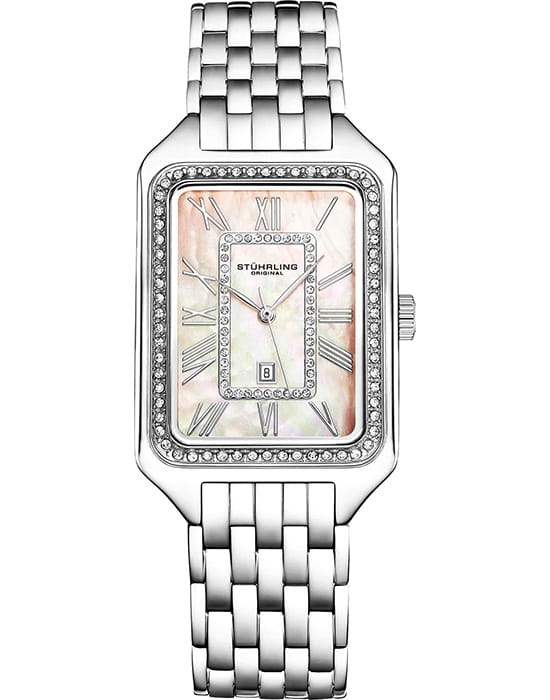 Stuhrling 4061.1 — изысканные женские часы, созданные в духе утончённой элегантности и современного гламура. Прямоугольный корпус с инкрустацией по периметру сияет на свету, подчёркивая благородство глубокого циферблата с утончёнными римскими цифрами и изящными стрелками. Центральная декоративная рамка придаёт модели архитектурную глубину и изысканный блеск. Корпус и браслет выполнены из нержавеющей стали, обеспечивая прочность и долговечность, а надёжная раскладная застёжкаРаскладная застёжкаТакой тип застёжки используется только на браслетах из металла. Она никогда не раскрывается полностью, происходит разделение на 2 и более частей. Раскладывающая застёжка снизит вероятность потери часов к минимуму. гарантирует комфортное и безопасное ношение. Циферблат защищён фирменным стеклом Krysterna, устойчивым к ударам и царапинам. Stuhrling — это гармония блеска, стиля и надёжности, идеально подходящая для женщины, ценящей классическую форму и современное сияние.