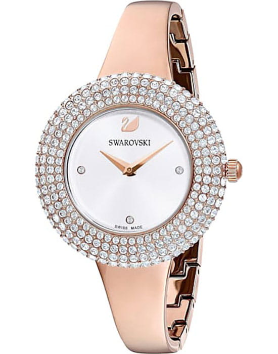 Женские часы Swarovski Crystal Rose 5484073 – это элегантные и утончённые часы, отличающиеся непревзойдённым сиянием. БезельБезельВнешний ободок, закрепляющий стекло. В спортивных часах так называется поворотное кольцо с делениями на циферблате, выполняет роль таймера – замеряет отрезки времени на шкале. Неподвижный безель – элемент декора. Однонаправленно вращающийся безель на дайверских часах позволяет фиксировать моменты погружения и выныривания на поверхность. украшен микропаве из 215 кристаллов. Завершающие штрихи уникального дизайна – корпус и браслет из нержавеющей стали с PVDPVDУльтратонкое покрытие наносится в технике вакуумного напыления, сочетает в себе нитрид титана особой прочности со слоем золота или оксида хрома. Несёт в себе декоративную или защитную функцию. покрытием оттенка розового золота и белый циферблат с рисунком в виде солнечных лучей и тремя метками из прозрачных кристаллов. Надежное минеральное стеклоМинеральное стеклоМинеральное стекло представляет собой искусственно выращенный минерал кварца. Такое стекло отличается особой устойчивостью к повреждениям и царапинам. Уступает по некоторым качествам сапфировому стеклу. защищает часы от царапин и долго сохраняет первоначальный внешний вид. Водозащита 50 метров делает часы практичными для повседневного использования.