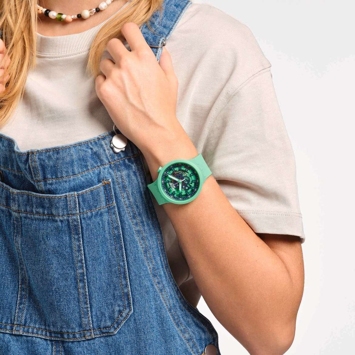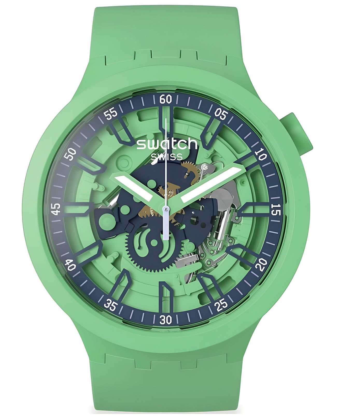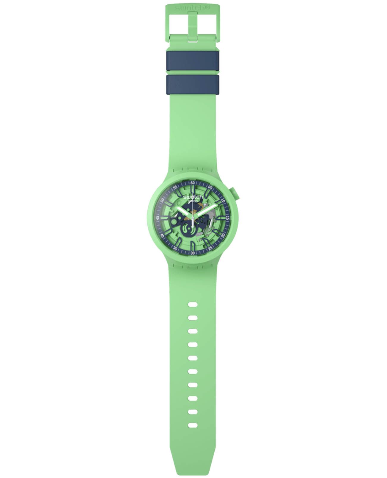 Часы Swatch SB01G101 — это стильный и современный аксессуар для тех, кто ценит лёгкость и комфорт. Часы идеально подойдут как для мужчин, так и для женщин. Корпус этих крупных часов выполнен из прочного матового пластика зеленого цвета, а ремешок — из силикона. На часовую, минутную стрелки нанесено люминесцентное покрытиеЛюминесцентное покрытиеПозволяет считывать показания времени в темноте. Производители наносят на стрелки, часовые индексы, безель или поверхность циферблата светонакопительный состав, дающий холодное свечение., которое светится в темноте, создавая необычное изображение. Водозащита 30 метров делает часы практичными для повседневного использования. Эти часы подойдут для повседневного ношения и станут ярким акцентом в вашем наряде.