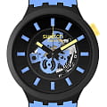 Часы Swatch SB03B108 — это стильный и современный аксессуар для тех, кто ценит лёгкость и комфорт. Часы идеально подойдут как для мужчин, так и для женщин. Центральный элемент этой модели часов — большой корпус со стеклом из био-материала, украшенный 3D-циферблатом с принтами на индексах. Корпус из биокерамикиБиокерамикаБиокерамика — это материал, который на две трети состоит из керамики, на одну треть — из биопластика. Он сочетает в себе лучшие качества обоих материалов и обладает прочностью и шелковистой на ощупь текстурой., а также силиконовые тренчики подчеркивают голубой принт на силиконовом ремешке этих огромных часов. На часовую, минутную стрелки нанесено люминесцентное покрытиеЛюминесцентное покрытиеПозволяет считывать показания времени в темноте. Производители наносят на стрелки, часовые индексы, безель или поверхность циферблата светонакопительный состав, дающий холодное свечение., которое светится в темноте, создавая необычное изображение. Водозащита 30 метров делает часы практичными для повседневного использования. Эти часы подойдут для повседневного ношения и станут ярким акцентом в вашем наряде.