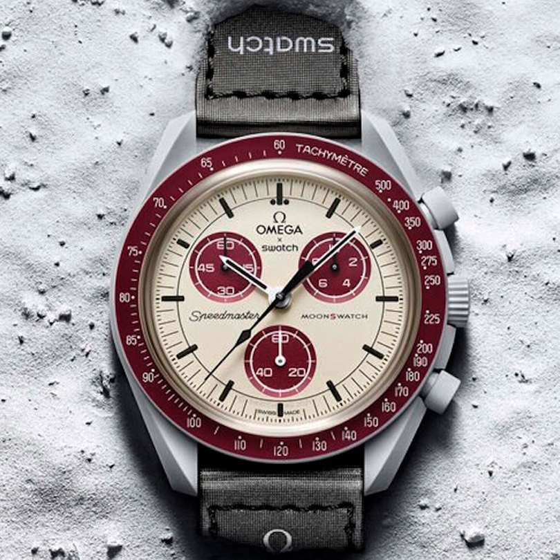 Часы Swatch Bioceramic Moonswatch MISSION TO PLUTO SO33M101 — это стильный и современный аксессуар для тех, кто ценит лёгкость и комфорт. Корпус диаметром 42 мм и пряжка этих уникальных часов изготовлены из биокерамикиБиокерамикаБиокерамика — это материал, который на две трети состоит из керамики, на одну треть — из биопластика. Он сочетает в себе лучшие качества обоих материалов и обладает прочностью и шелковистой на ощупь текстурой., а также ремешок VELCRO®. Модель оснащена циферблатом и бордовым биокерамическим безелемБезельВнешний ободок, закрепляющий стекло. В спортивных часах так называется поворотное кольцо с делениями на циферблате, выполняет роль таймера – замеряет отрезки времени на шкале. Неподвижный безель – элемент декора. Однонаправленно вращающийся безель на дайверских часах позволяет фиксировать моменты погружения и выныривания на поверхность. на который нанесена шкала тахиметраТахиметрРазмеченная шкала, располагается на ободке или безеле часов. Тахиметр позволяет рассчитать скорость на определённом участке пути, расстояние измеряется в километрах или милях.. Общими характеристиками всех часов в данной коллекции являются конструкция стекла из биоматериала, «скрытая» в центре кристалла буква "S", тонкий и изящный круговой узор на внешнем кольце циферблата и заглубленных мини-циферблатах, гладкие ушки с заостренными концами, культовая точка над отметкой 90 на тахиметрической шкале безеля и, конечно же, уникальный материал – биокерамика. Индексы, часовая, минутная и секундная стрелки хронографаХронографФункция позволяет измерять отрезки времени с особой точностью: часы, минуты, секунды. Верным признаком хронографа является наличие на циферблате 3 дополнительных окошек-счётчиков. покрыты люминесцентным покрытиемЛюминесцентное покрытиеПозволяет считывать показания времени в темноте. Производители наносят на стрелки, часовые индексы, безель или поверхность циферблата светонакопительный состав, дающий холодное свечение. Super-LumiNova® класса А, благодаря чему они светятся в темноте. Циферблаты каждых часов в данной коллекции украшены фирменным знаком OMEGA X Swatch, культовым логотипом Speedmaster и логотипом MoonSwatch.