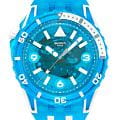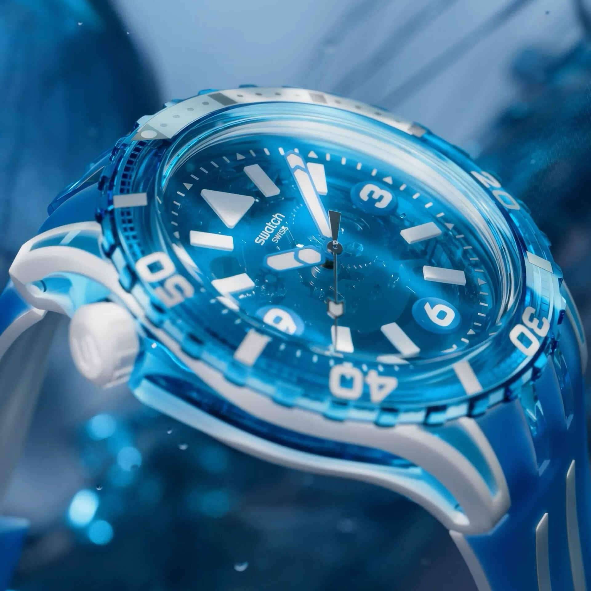 Мужские дайверские часы Swatch LION’S MANE SSCU09S100 — это стильный и современный аксессуар для тех, кто ценит лёгкость и комфорт. Корпус выполнен из биокерамики, который состоит из матовых и блестящих прозрачных частей из биоматериала, диаметром 44 мм и толщиной 15.4 мм, что обеспечивает долговечность и утончённый внешний вид. Циферблат защищён органическим стеклом, устойчивым к повреждениям. Модель оснащена кварцевым механизмом, обеспечивающим высокую точность хода. БезельБезельВнешний ободок, закрепляющий стекло. В спортивных часах так называется поворотное кольцо с делениями на циферблате, выполняет роль таймера – замеряет отрезки времени на шкале. Неподвижный безель – элемент декора. Однонаправленно вращающийся безель на дайверских часах позволяет фиксировать моменты погружения и выныривания на поверхность. из голубого просвечивающего биоматериала с серо-белым принтом, светящимся в темноте, и белая матовая заводная головка из биокерамики, размещенная в районе отметки 10 часов. Стрелки и метки с люминесцентным покрытиемЛюминесцентное покрытиеПозволяет считывать показания времени в темноте. Производители наносят на стрелки, часовые индексы, безель или поверхность циферблата светонакопительный состав, дающий холодное свечение.. Силиконовый ремешок на стандартной застёжке гармонично дополняет корпус и обеспечивает комфортное ношение. Водозащита 100 метров позволит плавать, нырять и заниматься другими водными видами спорта. Эти часы подойдут для повседневного ношения и станут ярким акцентом в вашем наряде.