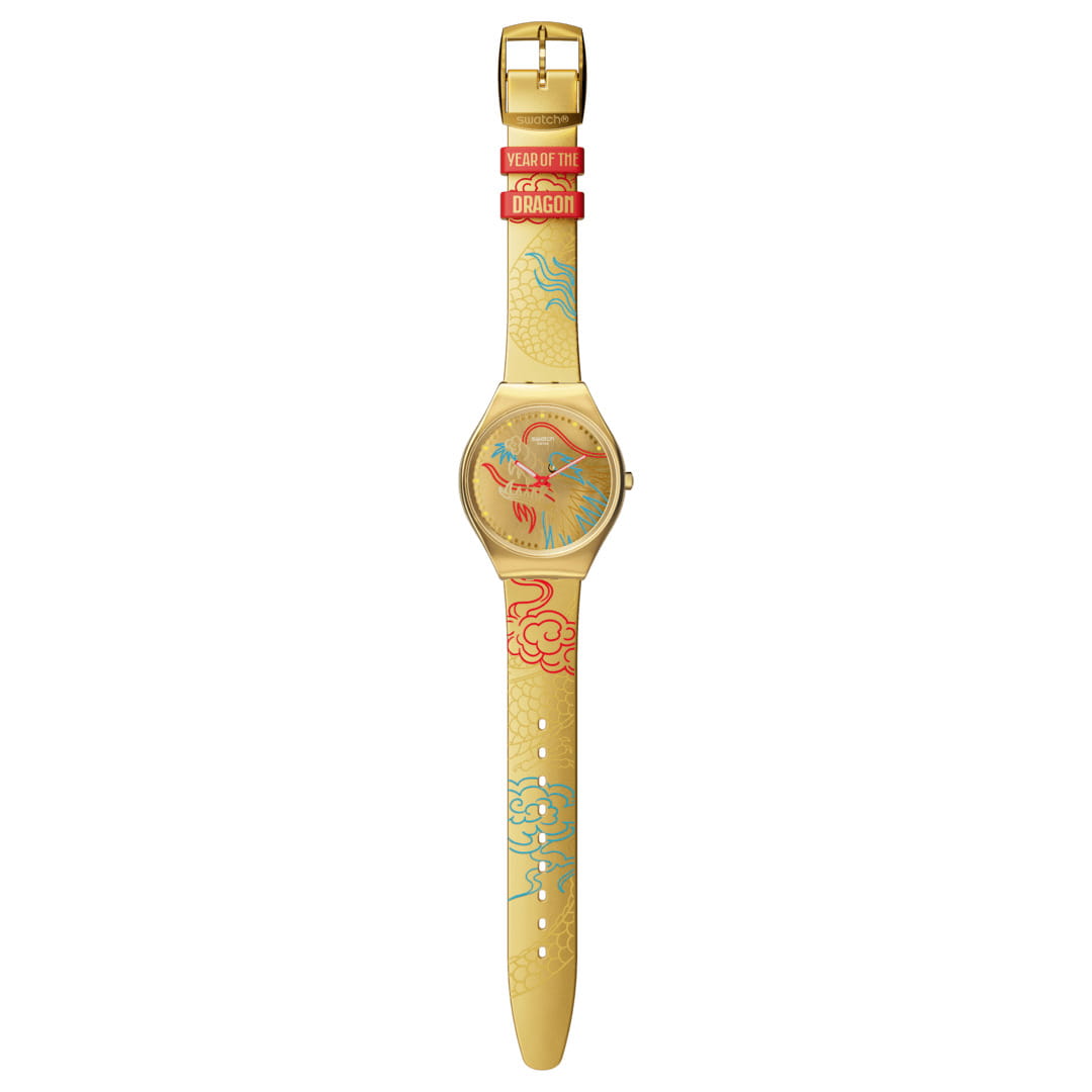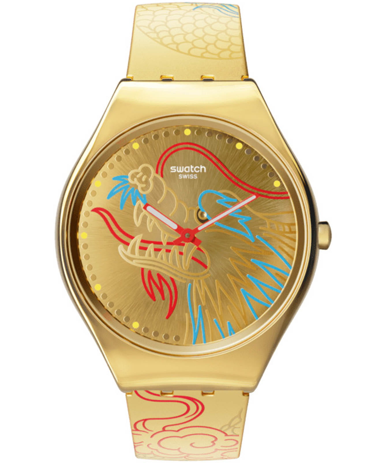 Часы Swatch SYXZ104 — это стильный и современный аксессуар для тех, кто ценит лёгкость и комфорт. Часы идеально подойдут как для мужчин, так и для женщин. Эти ультратонкие золотистые часы украшены разноцветным изображением дракона. Золотистый циферблат c PVDPVDУльтратонкое покрытие наносится в технике вакуумного напыления, сочетает в себе нитрид титана особой прочности со слоем золота или оксида хрома. Несёт в себе декоративную или защитную функцию. покрытием, с радиальной шлифовкой и принтом заключен в сияющий корпус и покрыт минеральным стекломМинеральное стеклоМинеральное стекло представляет собой искусственно выращенный минерал кварца. Такое стекло отличается особой устойчивостью к повреждениям и царапинам. Уступает по некоторым качествам сапфировому стеклу.. На золотистом ремешке с блестящей пряжкой в тон размещены два красных тренчика с надписями. На часовую, минутную стрелки розового цвета нанесено люминесцентное покрытиеЛюминесцентное покрытиеПозволяет считывать показания времени в темноте. Производители наносят на стрелки, часовые индексы, безель или поверхность циферблата светонакопительный состав, дающий холодное свечение., которое светится в темноте, создавая необычное изображение. Водозащита 30 метров делает часы практичными для повседневного использования. Эти часы подойдут для повседневного ношения и станут ярким акцентом в вашем наряде.