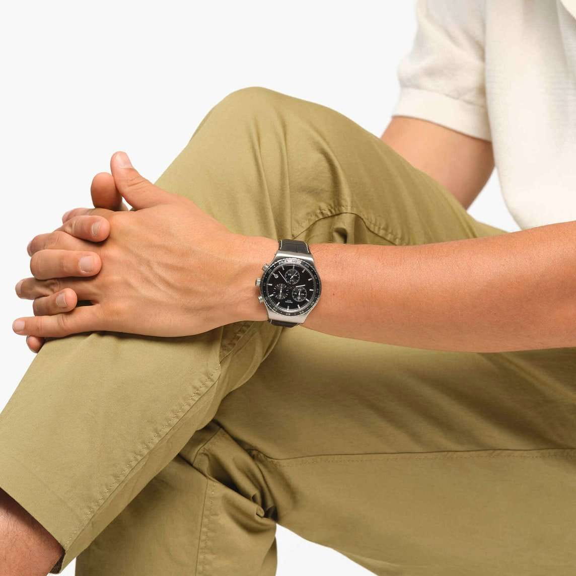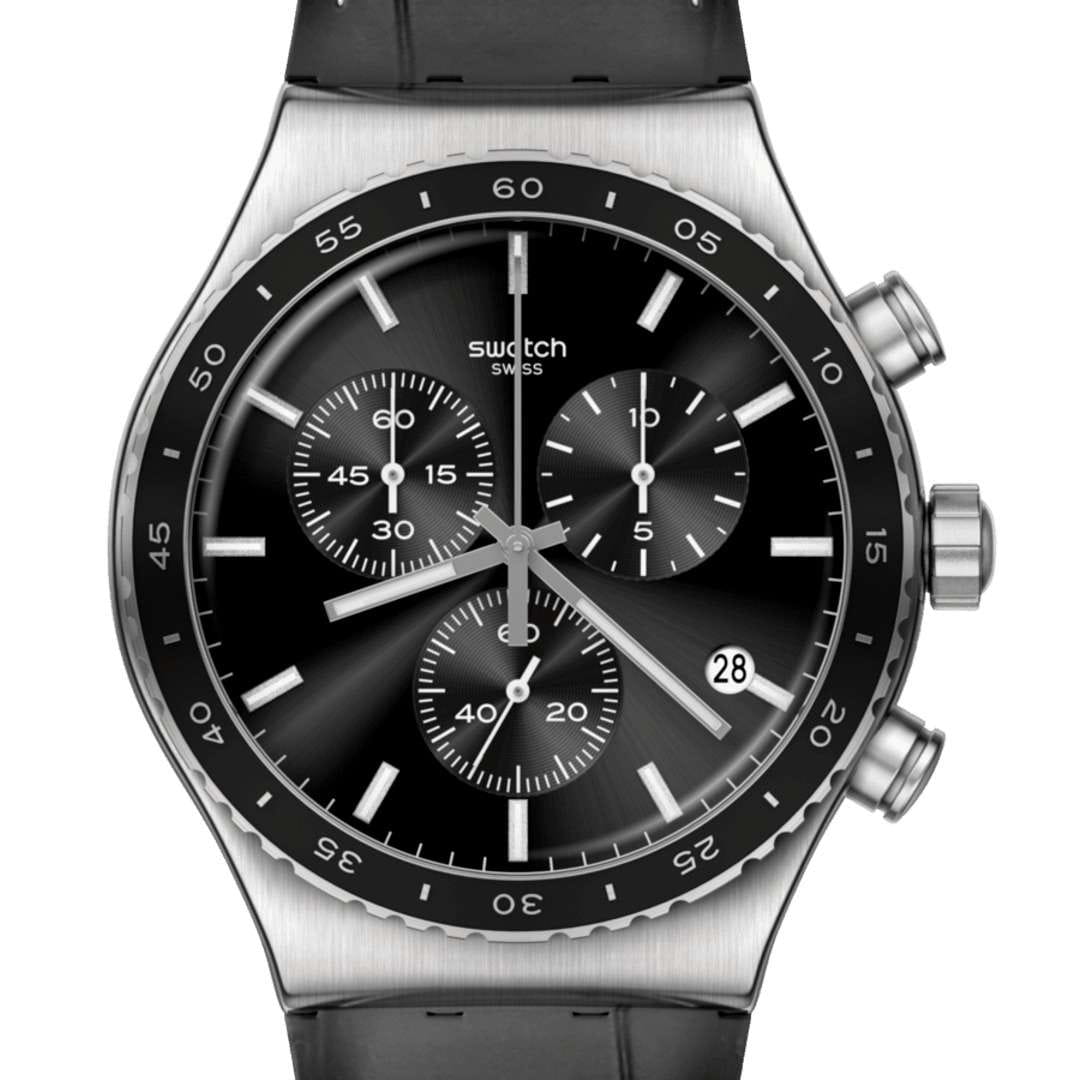 Часы Swatch YVS495 — это стильный и современный аксессуар для тех, кто ценит лёгкость и комфорт. Этот стильный хронографХронографФункция позволяет измерять отрезки времени с особой точностью: часы, минуты, секунды. Верным признаком хронографа является наличие на циферблате 3 дополнительных окошек-счётчиков. обладает элегантным черным циферблатом с окошком даты в положении «4:30», заключенны в матовый корпус из нержавеющей стали с полированными элементами. БезельБезельВнешний ободок, закрепляющий стекло. В спортивных часах так называется поворотное кольцо с делениями на циферблате, выполняет роль таймера – замеряет отрезки времени на шкале. Неподвижный безель – элемент декора. Однонаправленно вращающийся безель на дайверских часах позволяет фиксировать моменты погружения и выныривания на поверхность. этих часов с черным PVDPVDУльтратонкое покрытие наносится в технике вакуумного напыления, сочетает в себе нитрид титана особой прочности со слоем золота или оксида хрома. Несёт в себе декоративную или защитную функцию. покрытием, а кожаный ремешок — тиснением, имитирующим кожу аллигатора, и контрастной белой строчкой. На часовую, минутную стрелки нанесено люминесцентное покрытиеЛюминесцентное покрытиеПозволяет считывать показания времени в темноте. Производители наносят на стрелки, часовые индексы, безель или поверхность циферблата светонакопительный состав, дающий холодное свечение., которое светится в темноте, создавая необычное изображение. Водозащита 30 метров делает часы практичными для повседневного использования. Эти часы подойдут для повседневного ношения и станут ярким акцентом в вашем наряде.