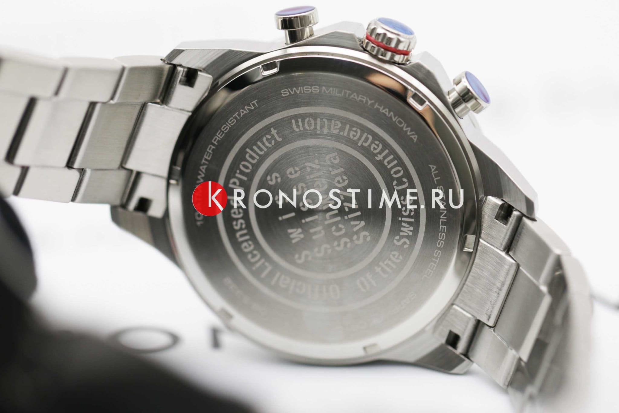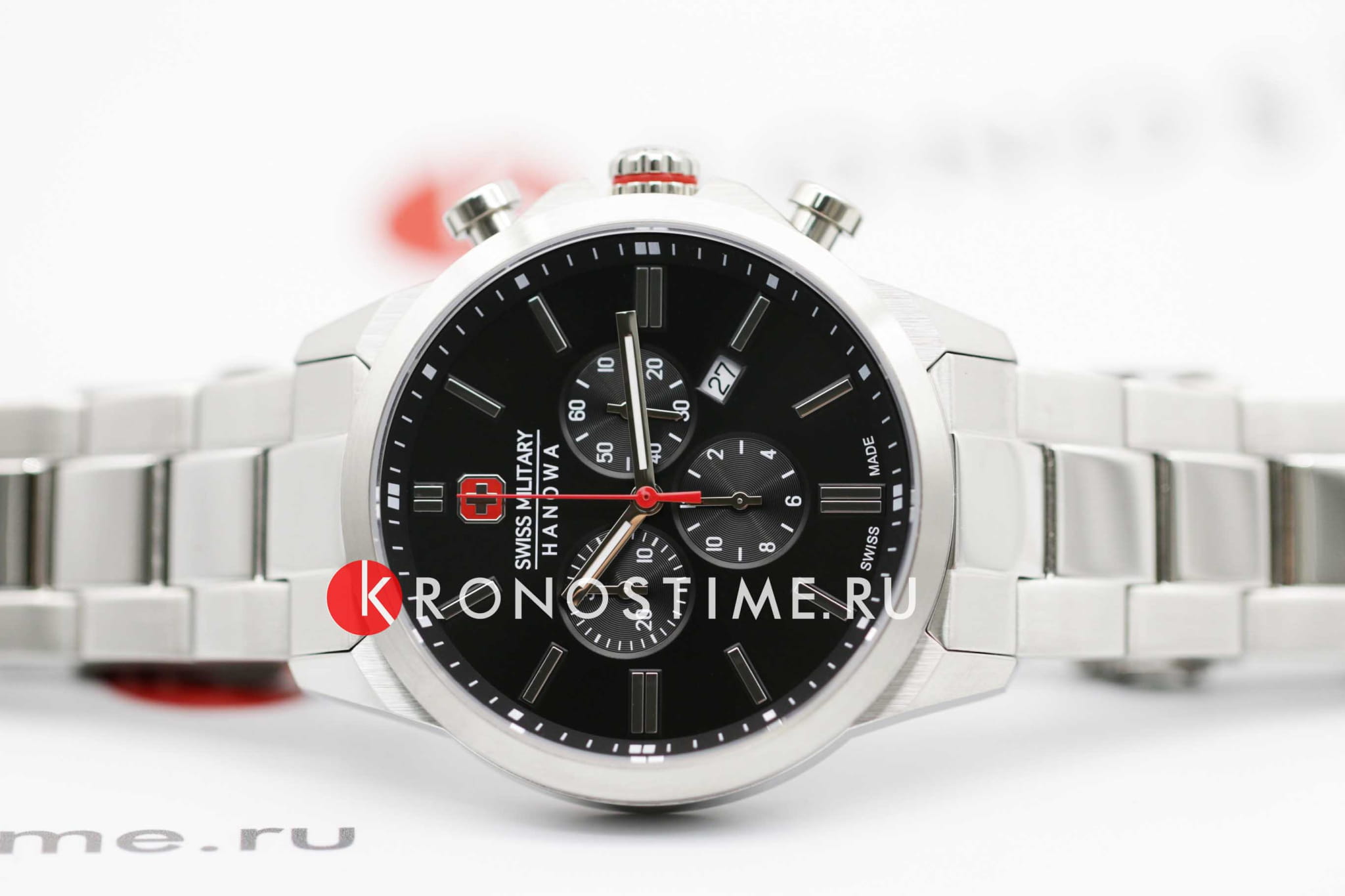 Мужские швейцарские часы-хронографХронографФункция позволяет измерять отрезки времени с особой точностью: часы, минуты, секунды. Верным признаком хронографа является наличие на циферблате 3 дополнительных окошек-счётчиков. с секундомеромСекундомерСекундоме́р — прибор, способный измерять интервалы времени с точностью до долей секунды. 06-5332.04.007 от популярного бренда Swiss Military Hanowa представляют собой спортивные аксессуары, измеряющие время с абсолютной «армейской» точностью. Циферблат модели украшен швейцарским крестом, что является отражением высоких стандартов качества. Корпус часов и браслет выполнены из стали. Циферблат с сапфировым стекломСапфировое стеклоПрочный и надёжный материал из кристалла сапфира синтетического происхождения, характеризующийся особой твёрдостью и устойчивостью к царапинам и повреждениям.. Заводная головка с защитой. Перед сборкой специалисты тщательно проверяют каждую деталь, для обнаружения мелких дефектов применяется электронное оборудование. Браслет с раскладной застёжкойРаскладная застёжкаТакой тип застёжки используется только на браслетах из металла. Она никогда не раскрывается полностью, происходит разделение на 2 и более частей. Раскладывающая застёжка снизит вероятность потери часов к минимуму.. Люминесцентное покрытиеЛюминесцентное покрытиеПозволяет считывать показания времени в темноте. Производители наносят на стрелки, часовые индексы, безель или поверхность циферблата светонакопительный состав, дающий холодное свечение. на стрелках и метках.