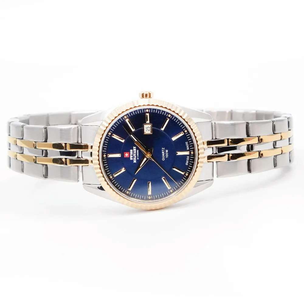 Женские швейцарские наручные часы Swiss Military by Chrono SM34066.09, кварцевый механизм с высокой точностью. Минеральное стеклоМинеральное стеклоМинеральное стекло представляет собой искусственно выращенный минерал кварца. Такое стекло отличается особой устойчивостью к повреждениям и царапинам. Уступает по некоторым качествам сапфировому стеклу. устойчивое к появлению царапин, обладающее высокой прозрачностью. Класс водозащиты: 50 метров, позволит защитить корпус от случайных брызг или капель дождя. Корпус часов изготовлен из стали.БезельБезельВнешний ободок, закрепляющий стекло. В спортивных часах так называется поворотное кольцо с делениями на циферблате, выполняет роль таймера – замеряет отрезки времени на шкале. Неподвижный безель – элемент декора. Однонаправленно вращающийся безель на дайверских часах позволяет фиксировать моменты погружения и выныривания на поверхность. с PVD-покрытиемPVDУльтратонкое покрытие наносится в технике вакуумного напыления, сочетает в себе нитрид титана особой прочности со слоем золота или оксида хрома. Несёт в себе декоративную или защитную функцию.. Браслет с раскладной застёжкойРаскладная застёжкаТакой тип застёжки используется только на браслетах из металла. Она никогда не раскрывается полностью, происходит разделение на 2 и более частей. Раскладывающая застёжка снизит вероятность потери часов к минимуму. и с частичным PVD-покрытиемPVDУльтратонкое покрытие наносится в технике вакуумного напыления, сочетает в себе нитрид титана особой прочности со слоем золота или оксида хрома. Несёт в себе декоративную или защитную функцию..
