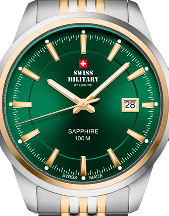 Модель SM34104.06 от Swiss Military by Chrono — это надёжные швейцарские часы в классическом стиле, сочетающие функциональность и сдержанный дизайн. Корпус и браслет выполнены из нержавеющей стали, подчёркивая прочность и элегантность конструкции. Строгий циферблат обеспечивает отличную читаемость, а функция отображения даты добавляет практичности. БезельБезельВнешний ободок, закрепляющий стекло. В спортивных часах так называется поворотное кольцо с делениями на циферблате, выполняет роль таймера – замеряет отрезки времени на шкале. Неподвижный безель – элемент декора. Однонаправленно вращающийся безель на дайверских часах позволяет фиксировать моменты погружения и выныривания на поверхность. с PVD-покрытиемPVDУльтратонкое покрытие наносится в технике вакуумного напыления, сочетает в себе нитрид титана особой прочности со слоем золота или оксида хрома. Несёт в себе декоративную или защитную функцию.. Часы оснащены кварцевым механизмом, обеспечивающим точный ход. Циферблат защищён сапфировым стекломСапфировое стеклоПрочный и надёжный материал из кристалла сапфира синтетического происхождения, характеризующийся особой твёрдостью и устойчивостью к царапинам и повреждениям., устойчивым к царапинам. Установлена раскладная застёжкаРаскладная застёжкаТакой тип застёжки используется только на браслетах из металла. Она никогда не раскрывается полностью, происходит разделение на 2 и более частей. Раскладывающая застёжка снизит вероятность потери часов к минимуму. для надёжной фиксации на запястье и частичное PVD-покрытиеPVDУльтратонкое покрытие наносится в технике вакуумного напыления, сочетает в себе нитрид титана особой прочности со слоем золота или оксида хрома. Несёт в себе декоративную или защитную функцию. браслета. Модель обладает водонепроницаемостью до 100 метров, что делает её подходящей для плавания и сноркелинга.
