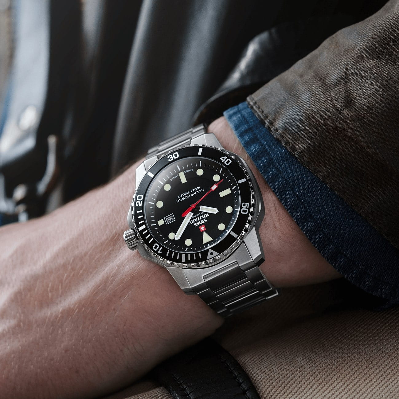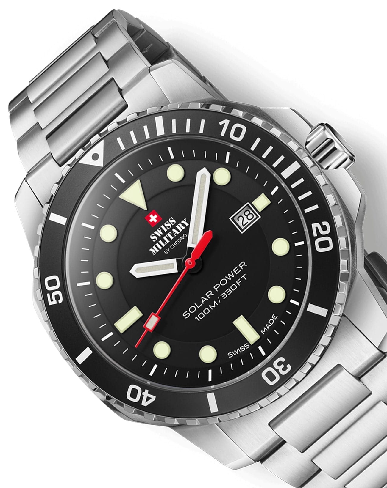 Модель SMS34102.01 от Swiss Military by Chrono — это надёжные швейцарские спортивные часы, сочетающие в себе прочность, функциональность и элегантный дизайн. Корпус и браслет выполнены из нержавеющей стали, подчёркивая прочность и элегантность конструкции. Циферблат с солнечным узором и крупными метками, покрытыми люминесцентным покрытиемЛюминесцентное покрытиеПозволяет считывать показания времени в темноте. Производители наносят на стрелки, часовые индексы, безель или поверхность циферблата светонакопительный состав, дающий холодное свечение., обеспечивает отличную читаемость в любых условиях. Часы оснащены швейцарским солнечным кварцевым механизмом Ronda Solartech Caliber 215, обеспечивающим точный ход и запас хода до 8 месяцев без подзарядки. Циферблат защищён сапфировым стекломСапфировое стеклоПрочный и надёжный материал из кристалла сапфира синтетического происхождения, характеризующийся особой твёрдостью и устойчивостью к царапинам и повреждениям., устойчивым к царапинам. Установлена раскладная застёжкаРаскладная застёжкаТакой тип застёжки используется только на браслетах из металла. Она никогда не раскрывается полностью, происходит разделение на 2 и более частей. Раскладывающая застёжка снизит вероятность потери часов к минимуму. для надёжной фиксации на запястье. Односторонний вращающийся безель с PVD-покрытиемPVDУльтратонкое покрытие наносится в технике вакуумного напыления, сочетает в себе нитрид титана особой прочности со слоем золота или оксида хрома. Несёт в себе декоративную или защитную функцию. позволяет точно отслеживать время. Модель обладает водонепроницаемостью до 100 метров, что делает её подходящей для плавания и сноркелинга.