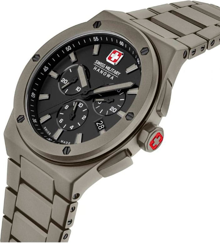 Мужские швейцарские часы с хронографомХронографФункция позволяет измерять отрезки времени с особой точностью: часы, минуты, секунды. Верным признаком хронографа является наличие на циферблате 3 дополнительных окошек-счётчиков. Swiss Military Hanowa Sidewinder Ceramic SMWGI0002285 станут отличным выбором для тех, кто ценит стильный дизайн и функциональность в одном аксессуаре. Корпус диаметром 43 мм сбалансирован и элегантен. Сапфировое стеклоСапфировое стеклоПрочный и надёжный материал из кристалла сапфира синтетического происхождения, характеризующийся особой твёрдостью и устойчивостью к царапинам и повреждениям. с антибликовым покрытием защищает циферблат от царапин и обеспечивает отличную читаемость при любом освещении. Керамический браслет с застежкой бабочкаЗастёжка "бабочка"Такой вид застёжки дополняется предохранителями, помогающими избежать случайного раскрытия браслета. Обладают изящным исполнением. идеально дополняют дизайн часов, обеспечивая комфортное ношение. Люминесцентное покрытиеЛюминесцентное покрытиеПозволяет считывать показания времени в темноте. Производители наносят на стрелки, часовые индексы, безель или поверхность циферблата светонакопительный состав, дающий холодное свечение. стрелок и меток позволит вам следить за временем даже в полной темноте. Метки выполнены в виде штрихов. Окошко даты в положении 4 часа.