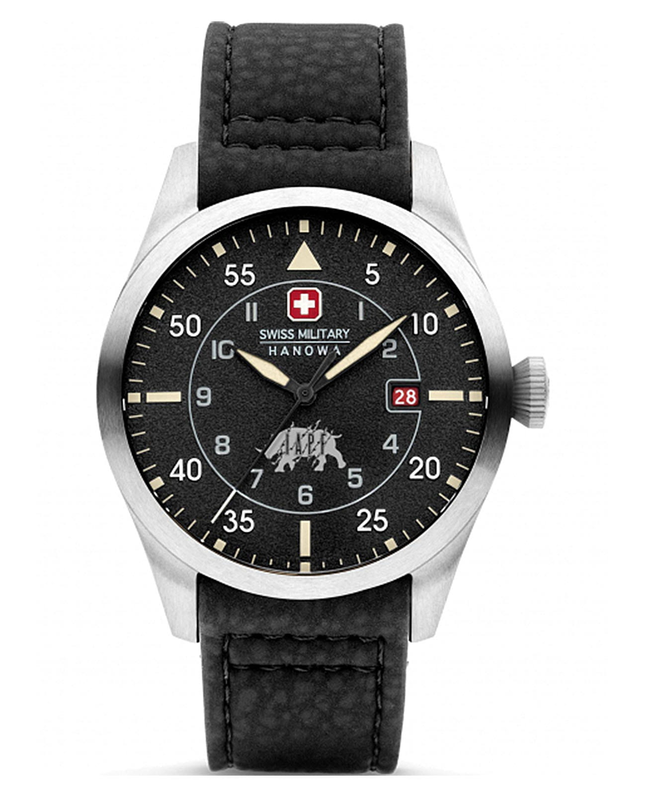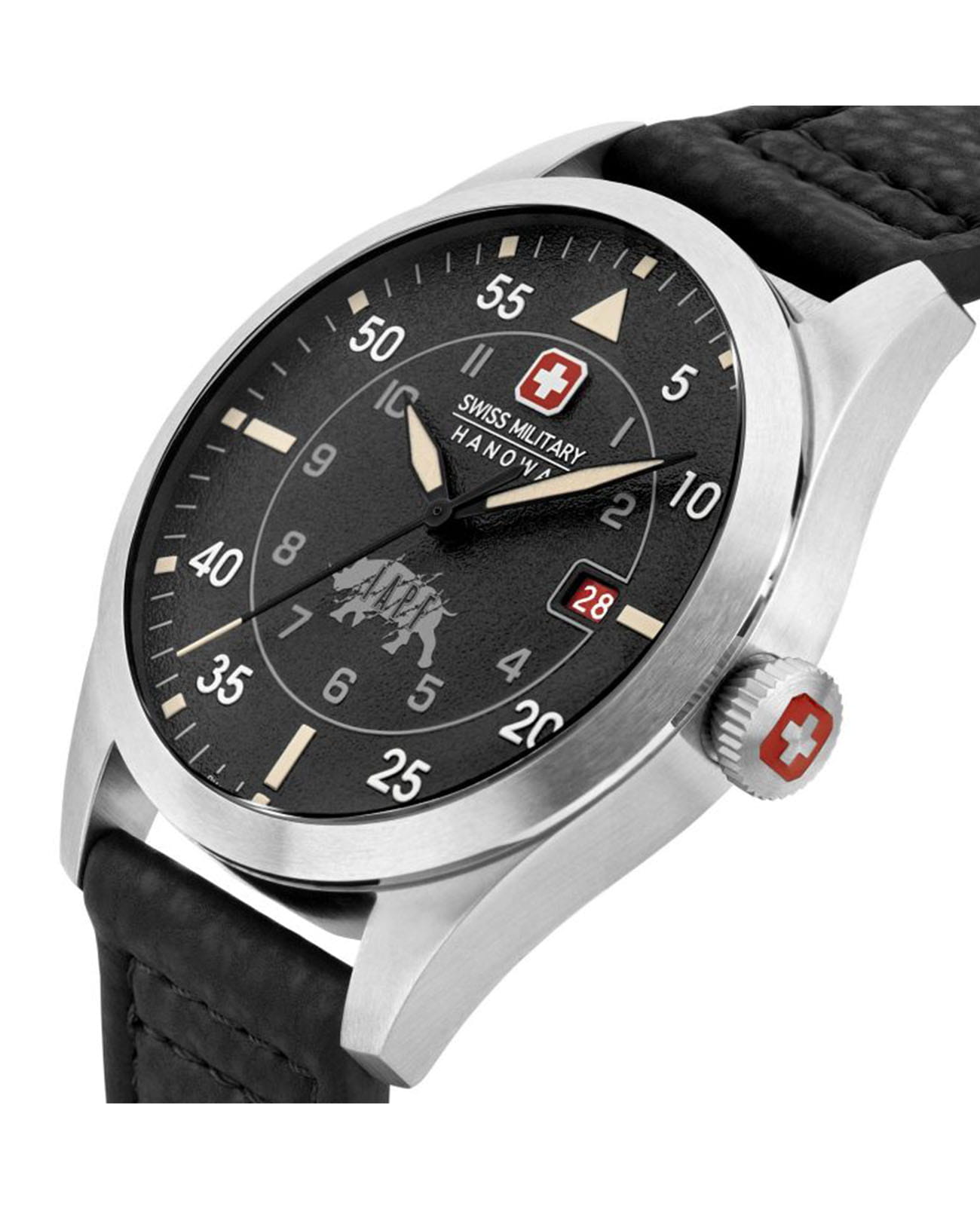 Мужские швейцарские часы Swiss Military Hanowa Lead Ranger SMWGN0001201, кварцевый механизм с высокой точностью. Сапфировое стеклоСапфировое стеклоПрочный и надёжный материал из кристалла сапфира синтетического происхождения, характеризующийся особой твёрдостью и устойчивостью к царапинам и повреждениям. устойчивое к появлению царапин, обладающее высокой прозрачностью. Корпус часов изготовлен из нержавеющей стали. Стрелки с люминесцентным покрытиемЛюминесцентное покрытиеПозволяет считывать показания времени в темноте. Производители наносят на стрелки, часовые индексы, безель или поверхность циферблата светонакопительный состав, дающий холодное свечение.. Окошко даты в положении 3 часов. Класс водозащиты: 100 метров, позволит плавать, нырять и заниматься другими водными видами спорта. Кожаный ремешок на стандартной застежке.