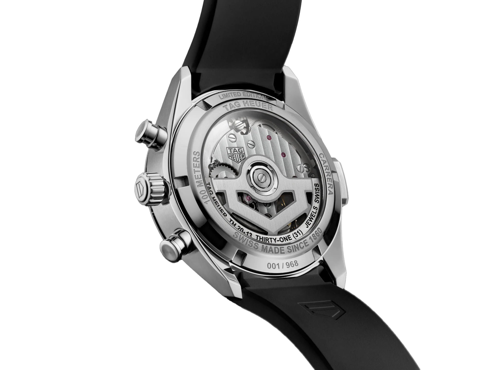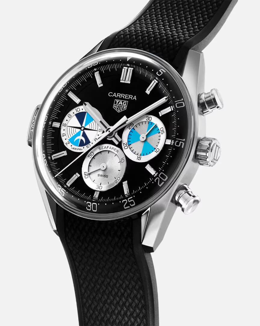 TAG Heuer Carrera Chronograph Seafarer x Hodinkee — лимитированная серия часовых моделей с неподвластным времени дизайном и характеристиками точности, отвечающими современным критериям. Дизайн навеян моделью Heuer Seafarer Reference 2446C 1968 года. Синие акценты на дополнительных счетчиках придают ему визуальную привлекательность и функциональное превосходство. Корпус часов изготовлен из нержавеющей стали. Сапфировое стеклоСапфировое стеклоПрочный и надёжный материал из кристалла сапфира синтетического происхождения, характеризующийся особой твёрдостью и устойчивостью к царапинам и повреждениям. устойчивое к появлению царапин, обладающее высокой прозрачностью. Класс водозащиты: 100 метров, позволит плавать, нырять и заниматься другими водными видами спорта. Стрелки с люминесцентным покрытиемЛюминесцентное покрытиеПозволяет считывать показания времени в темноте. Производители наносят на стрелки, часовые индексы, безель или поверхность циферблата светонакопительный состав, дающий холодное свечение.. ХронографХронографФункция позволяет измерять отрезки времени с особой точностью: часы, минуты, секунды. Верным признаком хронографа является наличие на циферблате 3 дополнительных окошек-счётчиков.. Каучуковый ремень на раскладной застёжкеРаскладная застёжкаТакой тип застёжки используется только на браслетах из металла. Она никогда не раскрывается полностью, происходит разделение на 2 и более частей. Раскладывающая застёжка снизит вероятность потери часов к минимуму..