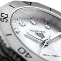 Женские швейцарские часы TAG Heuer Aquaracer Professional 200 WBP1416.BA0622, кварцевый механизм с высокой точностью. Сапфировое стеклоСапфировое стеклоПрочный и надёжный материал из кристалла сапфира синтетического происхождения, характеризующийся особой твёрдостью и устойчивостью к царапинам и повреждениям. устойчивое к появлению царапин, обладающее высокой прозрачностью. Класс водозащиты: 200 метров, позволит плавать, нырять и заниматься другими водными видами спорта. Корпус часов изготовлен из стали. Стальной браслет на раскладной застёжкеРаскладная застёжкаТакой тип застёжки используется только на браслетах из металла. Она никогда не раскрывается полностью, происходит разделение на 2 и более частей. Раскладывающая застёжка снизит вероятность потери часов к минимуму.. Стальной рифленый вращающийся 12-гранный безельБезельВнешний ободок, закрепляющий стекло. В спортивных часах так называется поворотное кольцо с делениями на циферблате, выполняет роль таймера – замеряет отрезки времени на шкале. Неподвижный безель – элемент декора. Однонаправленно вращающийся безель на дайверских часах позволяет фиксировать моменты погружения и выныривания на поверхность. с минутной шкалой выполнен с радиальным сатинированием поверхности. Перламутровый циферблат украшен 12-ю бриллиантами. Метки в виде штрихов. Стрелки и метки с родиевым и люминесцентным покрытиемЛюминесцентное покрытиеПозволяет считывать показания времени в темноте. Производители наносят на стрелки, часовые индексы, безель или поверхность циферблата светонакопительный состав, дающий холодное свечение. Superluminova. Рифленая заводная головка с защитой. Задняя крышка украшена выгравированной 8-лучевой розой ветров на фоне узора сотовой структуры.