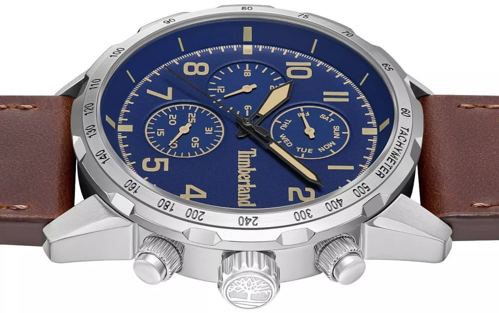 Американские мужские часы-хронографХронографФункция позволяет измерять отрезки времени с особой точностью: часы, минуты, секунды. Верным признаком хронографа является наличие на циферблате 3 дополнительных окошек-счётчиков. c тахиметромТахиметрРазмеченная шкала, располагается на ободке или безеле часов. Тахиметр позволяет рассчитать скорость на определённом участке пути, расстояние измеряется в километрах или милях. Timberland TDWGF0055401 — это сочетание надежности, функциональности и уверенного стиля. Модель идеально подойдет для тех, кто ценит точность и выносливость в каждой детали. Часы оснащены кварцевым механизмом , гарантирующим высокую точность хода и минимальное обслуживание. В конструкции использовано прочное минеральное стеклоМинеральное стеклоМинеральное стекло представляет собой искусственно выращенный минерал кварца. Такое стекло отличается особой устойчивостью к повреждениям и царапинам. Уступает по некоторым качествам сапфировому стеклу., устойчивое к мелким повреждениям и долговечное в использовании. Корпус выполнен из нержавеющей стали, что обеспечивает стойкость к царапинам и длительный срок службы без потери внешнего вида. Стрелки часов имеют люминесцентное покрытиеЛюминесцентное покрытиеПозволяет считывать показания времени в темноте. Производители наносят на стрелки, часовые индексы, безель или поверхность циферблата светонакопительный состав, дающий холодное свечение., позволяющее считывать время даже в условиях слабого освещения. Дизайн дополнен кожаным ремешком с классической застежкой и системой быстрой замены , что делает использование часов максимально удобным и комфортным при ежедневной носке. Класс водозащиты WR50 позволяет использовать часы в повседневных условиях, включая мытьё рук или прогулки под дождем.