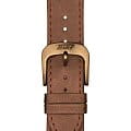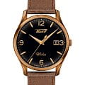 Наручные часы представляют собой современные технологии в сочетании с винтажным дизайном, во внешнем облике угадываются черты моделей 1960-х годов. Лаконичный чёрный циферблат имеет золотистые стрелки, цифры и метки, что весьма гармонично смотрится. Корпус имеет состаренное золотистое PVD-покрытиеPVDУльтратонкое покрытие наносится в технике вакуумного напыления, сочетает в себе нитрид титана особой прочности со слоем золота или оксида хрома. Несёт в себе декоративную или защитную функцию.. Кварцевый механизм ETA F06.111. Ремешок из тиснёной натуральной кожи. Сапфировое стекло. Функция EOLEOLПредставляет собой систему, уведомляющую владельца часов о необходимости замены элемента питания. За 2 недели до полного разряда батарейки секундная стрелка перестаёт ходить чётко и начинает перепрыгивать на 3-4 деления., отображение текущего числа. Габариты: 40 x 40 x 10,7 мм.