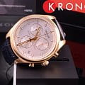 Синий цвет ремешка из натуральной кожи прекрасно гармонирует с розовато-золотистым PVD-покрытиемPVDУльтратонкое покрытие наносится в технике вакуумного напыления, сочетает в себе нитрид титана особой прочности со слоем золота или оксида хрома. Несёт в себе декоративную или защитную функцию. корпуса. Минималистичный циферблат дополнен счётчиками хронографаХронографФункция позволяет измерять отрезки времени с особой точностью: часы, минуты, секунды. Верным признаком хронографа является наличие на циферблате 3 дополнительных окошек-счётчиков., что добавляет аксессуару элементы спортивного дизайна. Запоминающийся внешний вид. Кварцевый калибр ETA G10.211. Прочное сапфировое стекло. Люминесцентная подсветкаЛюминесцентное покрытиеПозволяет считывать показания времени в темноте. Производители наносят на стрелки, часовые индексы, безель или поверхность циферблата светонакопительный состав, дающий холодное свечение.. Функции: хронограф, секундомер, календарь. Габариты: 41 x 41 x 10,7 мм.