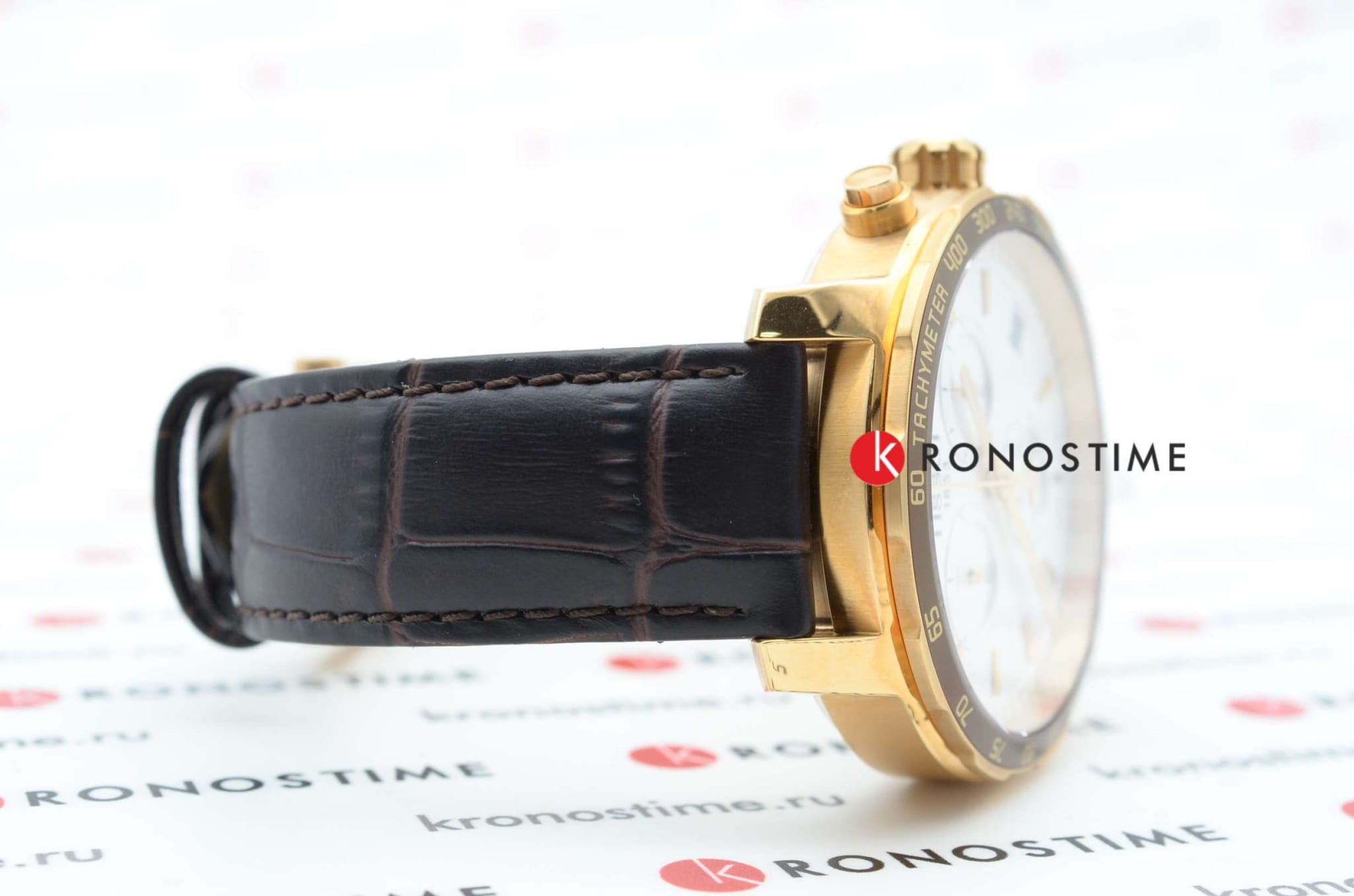 Внушительный корпус 42 мм имеет PVD-покрытиеPVDУльтратонкое покрытие наносится в технике вакуумного напыления, сочетает в себе нитрид титана особой прочности со слоем золота или оксида хрома. Несёт в себе декоративную или защитную функцию. цвета розового золота, модель сочетает в себе классические и спортивные элементы. Золотистые метки и стрелки чётко выделяются на белом фоне циферблата с миниатюрными счётчиками хронографаХронографФункция позволяет измерять отрезки времени с особой точностью: часы, минуты, секунды. Верным признаком хронографа является наличие на циферблате 3 дополнительных окошек-счётчиков.. Часы оснащены кварцевым калибром ETA G10.211 с высокой точностью хода. Сапфировое стекло. Водонепроницаемость 100 метров. Секундомер, тахиметрическая шкалаТахиметрРазмеченная шкала, располагается на ободке или безеле часов. Тахиметр позволяет рассчитать скорость на определённом участке пути, расстояние измеряется в километрах или милях., окошко даты. Габариты: 42 x 42 x 10,7 мм.