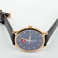 На синем циферблате расположены арабские цифры 6 и 12, остальные заменяют лаконичные часовые метки делений. Корпус имеет PVD-покрытиеPVDУльтратонкое покрытие наносится в технике вакуумного напыления, сочетает в себе нитрид титана особой прочности со слоем золота или оксида хрома. Несёт в себе декоративную или защитную функцию. в цвете "розовое золото", такое исполнение аксессуара делает его более привлекательным. Работа часов осуществляется благодаря кварцевому механизму ETA F06.111 с высокой точностью хода. Ремешок из натуральной кожи с тиснением под кожу крокодила. Сапфировое стекло. . Индикация даты. Габариты: 42 x 42 x 7,47 мм.