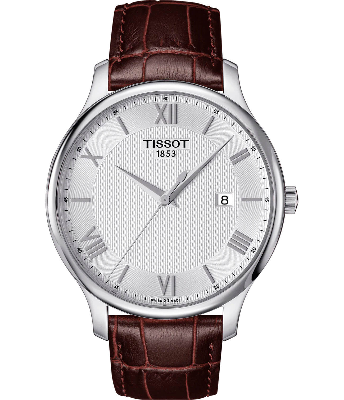 Мужские наручные часы Tissot Tradition T063.610.16.038.00 из коллекции T-Classic сочетают в себе классический дизайн и надежность современных технологий. Модель обладает круглым корпусом диаметром 42 мм, изготовленным из нержавеющей стали, что обеспечивает высокую устойчивость к внешним воздействиям. Браслет выполнен из коричневой кожи на застёжка «бабочка» с кнопкамиЗастёжка "бабочка"Такой вид застёжки дополняется предохранителями, помогающими избежать случайного раскрытия браслета. Обладают изящным исполнением. , гарантирующей комфортное ношение. Серебристый циферблат украшен классическими индексами и оснащен окном даты на позиции «6 часов». Для защиты используется выпуклое сапфировое стеклоСапфировое стеклоПрочный и надёжный материал из кристалла сапфира синтетического происхождения, характеризующийся особой твёрдостью и устойчивостью к царапинам и повреждениям. с антибликовым покрытиемАнтибликовое покрытиеСлой оксида металла в 0,13-0,3 микрон, благодаря которому стекло часов не бликует и не отражает свет. Антибликовое покрытие уменьшает отражение света в 10 раз, обеспечивая отличную читаемость показателей циферблата., обеспечивающее прочную защиту от царапин и превосходную видимость при любых условиях освещения [[8]]. Часы работают на швейцарском кварцевом механизме ETA F06.111, что гарантирует точное время без необходимости подзаводки. Водонепроницаемость часов достигает 3 атмосфер (30 метров), что позволяет использовать их при легком контакте с водой, например, во время мытья рук, но не рекомендуется для плавания или дайвинга. Эта модель станет идеальным выбором для тех, кто ценит классический стиль и безупречное качество исполнения.