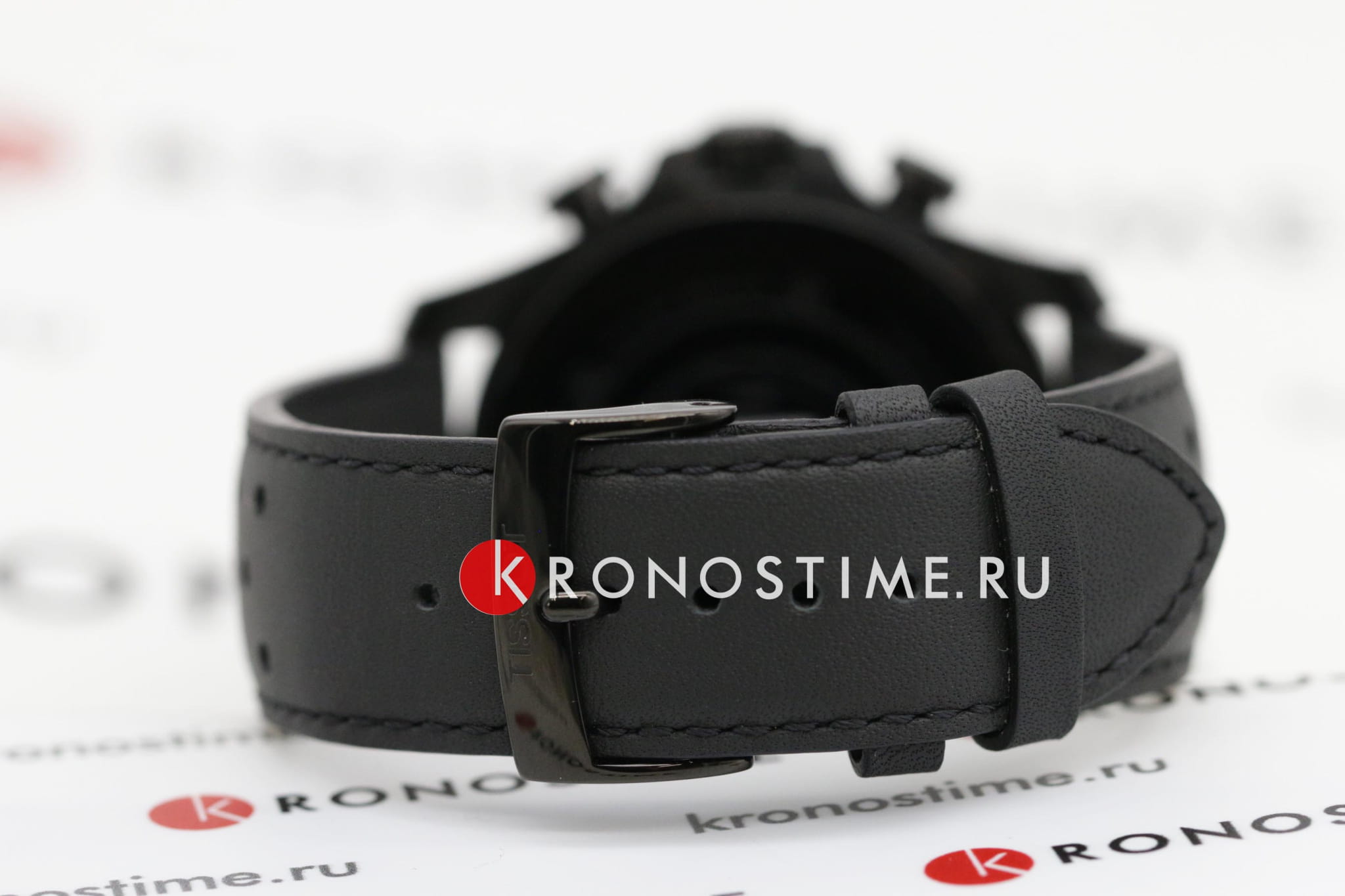 Стильный аксессуар полностью выполнен в чёрном цвете, исключение составляют лишь серебристые часовые метки и стрелки, а также ободок счётчиков хронографаХронографФункция позволяет измерять отрезки времени с особой точностью: часы, минуты, секунды. Верным признаком хронографа является наличие на циферблате 3 дополнительных окошек-счётчиков.. Подобный дизайн считается универсальным, что делает возможным носить часы с любой одеждой. Кварцевый механизм ETA G10.212. PVD-покрытиеPVDУльтратонкое покрытие наносится в технике вакуумного напыления, сочетает в себе нитрид титана особой прочности со слоем золота или оксида хрома. Несёт в себе декоративную или защитную функцию. корпуса. Люминесцентная подсветкаЛюминесцентное покрытиеПозволяет считывать показания времени в темноте. Производители наносят на стрелки, часовые индексы, безель или поверхность циферблата светонакопительный состав, дающий холодное свечение.. Опции: секундомер, тахиметрТахиметрРазмеченная шкала, располагается на ободке или безеле часов. Тахиметр позволяет рассчитать скорость на определённом участке пути, расстояние измеряется в километрах или милях., индикация даты. Габариты: 42,5 x 42,5 x 11,2 мм.