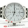 Модель не отличается богатым декором или броскими деталями, её особенность заключается в наличии полезного функционала и минималистичном строгом дизайне. Наручные часы привлекают серебристыми переливами корпуса и браслета, циферблат было решено оставить в белом цвете. Они комплектуются высокоточным кварцевым механизмом ETA G10.212. Сохранение водонепроницаемости при давлении до 50 бар. Надёжное сапфировое стекло. ХронографХронографФункция позволяет измерять отрезки времени с особой точностью: часы, минуты, секунды. Верным признаком хронографа является наличие на циферблате 3 дополнительных окошек-счётчиков., секундомер, отображение даты. . Габариты: 41 x 41 x 10,2 мм.