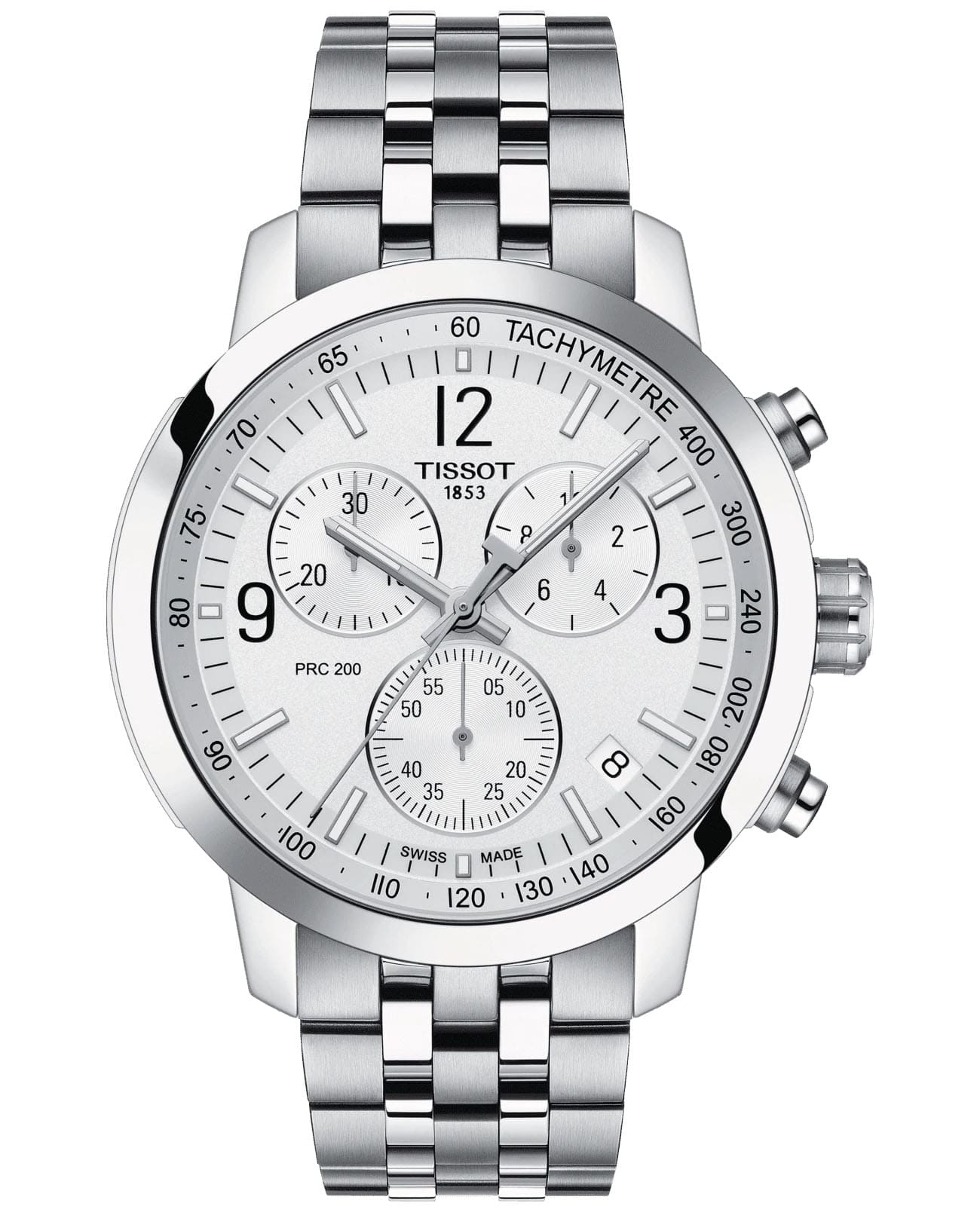 Мужские швейцарские часы из коллекции Tissot PRC 200 представляют собой высокоточный спортивный хронографХронографФункция позволяет измерять отрезки времени с особой точностью: часы, минуты, секунды. Верным признаком хронографа является наличие на циферблате 3 дополнительных окошек-счётчиков., они станут отличным вариантом на каждый день. Швейцарские кварцевые часы комплектуются механизмом ETA G10.211 – популярный калибр с высокой точностью хода.Белый циферблат дополнен стильными элементами: большие кнопки, 3 дополнительных счётчика, чёткие часовые индексы и конические стрелки с люминесцентной подсветкойЛюминесцентное покрытиеПозволяет считывать показания времени в темноте. Производители наносят на стрелки, часовые индексы, безель или поверхность циферблата светонакопительный состав, дающий холодное свечение.. Корпус из нержавеющей стали 316L. Завинчивающиеся заводная головка и задняя крышка корпуса. Водонепроницаемость 200 метров. Габариты: 42 x 43 x 12 мм. Производство и сборка: Швейцария.