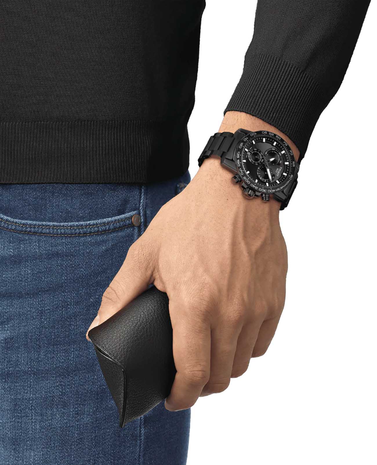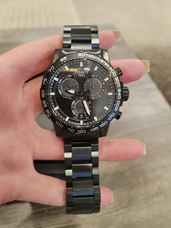 Современный хронографХронографФункция позволяет измерять отрезки времени с особой точностью: часы, минуты, секунды. Верным признаком хронографа является наличие на циферблате 3 дополнительных окошек-счётчиков. поможет подчеркнуть продуманный образ делового мужчины. Модель выполнена в чёрной-белой расцветке. Наручные часы функционируют благодаря швейцарскому кварцевому механизму ETA G10.212. Калибр отличается максимальной точностью хода. Стекло из сапфира. Водостойкость 100 метров. Надёжный корпус из антикоррозионной стали 316L с чёрным PVD-покрытиемPVDУльтратонкое покрытие наносится в технике вакуумного напыления, сочетает в себе нитрид титана особой прочности со слоем золота или оксида хрома. Несёт в себе декоративную или защитную функцию.. Люминесцентная подсветкаЛюминесцентное покрытиеПозволяет считывать показания времени в темноте. Производители наносят на стрелки, часовые индексы, безель или поверхность циферблата светонакопительный состав, дающий холодное свечение. стрелок и индексов. Секундомер, отображение даты. Диаметр корпуса: 45,5 мм.