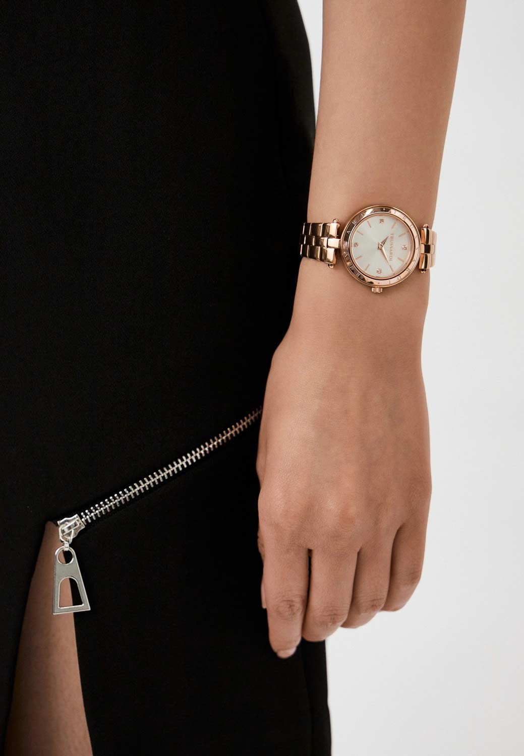 Итальянские женские часы Trussardi T-Shiny R2453145512 - это стильный женский аксессуар, который сочетает элегантный дизайн и практичность. Корпус выполнен из нержавеющей стали с IP-покрытиемIP-покрытиеМетод ионного напыления. Демонстрирует повышенную устойчивость к истиранию, окислению и химическим веществам. Под воздействием высокого давления и температуры около 1500°C молекулы металла надёжно соединяются с частицами корпуса часов., что обеспечивает долговечность и утончённый внешний вид. Надежное минеральное стеклоМинеральное стеклоМинеральное стекло представляет собой искусственно выращенный минерал кварца. Такое стекло отличается особой устойчивостью к повреждениям и царапинам. Уступает по некоторым качествам сапфировому стеклу. защищает циферблат с кристаллами от царапин и обеспечивает долговечность. Модель оснащена кварцевым механизмом, обеспечивающим высокую точность хода. Браслет из нержавеющей стали с IP-покрытиемIP-покрытиеМетод ионного напыления. Демонстрирует повышенную устойчивость к истиранию, окислению и химическим веществам. Под воздействием высокого давления и температуры около 1500°C молекулы металла надёжно соединяются с частицами корпуса часов. на раскладной застёжкеРаскладная застёжкаТакой тип застёжки используется только на браслетах из металла. Она никогда не раскрывается полностью, происходит разделение на 2 и более частей. Раскладывающая застёжка снизит вероятность потери часов к минимуму. обеспечивает комфортное ношение. Водозащита 50 метров позволит защитить корпус от случайных брызг или капель дождя. Эта модель – отличный выбор для тех, кто ищет сочетание стиля, качества и функциональности. Часы станут не только полезным аксессуаром, но и выразительным элементом вашего имиджа.