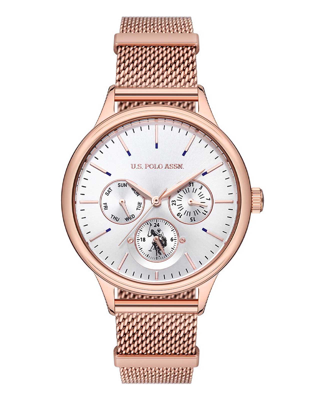 Женские часы U.S. Polo Assn USPA2010-01, кварцевый механизм с высокой точностью. Минеральное стеклоМинеральное стеклоМинеральное стекло представляет собой искусственно выращенный минерал кварца. Такое стекло отличается особой устойчивостью к повреждениям и царапинам. Уступает по некоторым качествам сапфировому стеклу. устойчивое к появлению царапин, обладающее высокой прозрачностью. Корпус изготовлен из нержавеющей стали с IP-покрытиемIP-покрытиеМетод ионного напыления. Демонстрирует повышенную устойчивость к истиранию, окислению и химическим веществам. Под воздействием высокого давления и температуры около 1500°C молекулы металла надёжно соединяются с частицами корпуса часов.. 24-х часовой формат времени, окошко даты и дня недели вынесены на отдельный циферблат. Класс водозащиты: 50 метров, позволит защитить корпус от случайных брызг или капель дождя. Стальной браслет миланского плетения с IP-покрытиемIP-покрытиеМетод ионного напыления. Демонстрирует повышенную устойчивость к истиранию, окислению и химическим веществам. Под воздействием высокого давления и температуры около 1500°C молекулы металла надёжно соединяются с частицами корпуса часов. на раскладном замкеРаскладной замокДанный вариант застежки используется только на часах с металлическим браслетом. Отличительная особенность такого крепления в том, что длина браслета становится универсальной и вы можете самостоятельно отрегулировать нужный вам размер – застежка просто двигается по браслету часов..