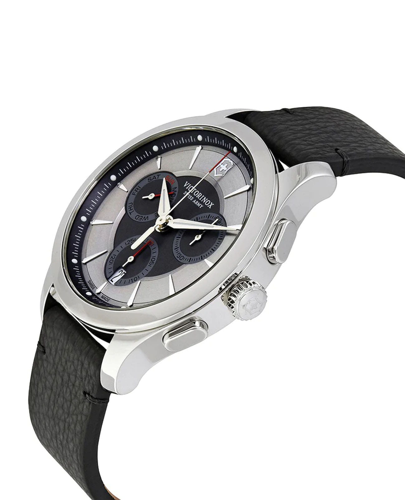 Мужские часы-хронографХронографФункция позволяет измерять отрезки времени с особой точностью: часы, минуты, секунды. Верным признаком хронографа является наличие на циферблате 3 дополнительных окошек-счётчиков. Victorinox ALLIANCE Sport Chronograph 241748, кварцевый механизм с высокой точностью. Сапфировое стеклоСапфировое стеклоПрочный и надёжный материал из кристалла сапфира синтетического происхождения, характеризующийся особой твёрдостью и устойчивостью к царапинам и повреждениям. с тройным антибликовым покрытием. Корпус часов изготовлен из нержавеющей стали. Накладные полированные клиновидные индексы. Стрелки и метки с люминесцентным покрытиемЛюминесцентное покрытиеПозволяет считывать показания времени в темноте. Производители наносят на стрелки, часовые индексы, безель или поверхность циферблата светонакопительный состав, дающий холодное свечение.. Окошко даты находится в положении 6 часов. Завинчивающаяся задняя крышка. Класс водозащиты: 100 метров, позволит плавать, нырять и заниматься другими водными видами спорта. Кожаный ремешок на стандартной застежке.