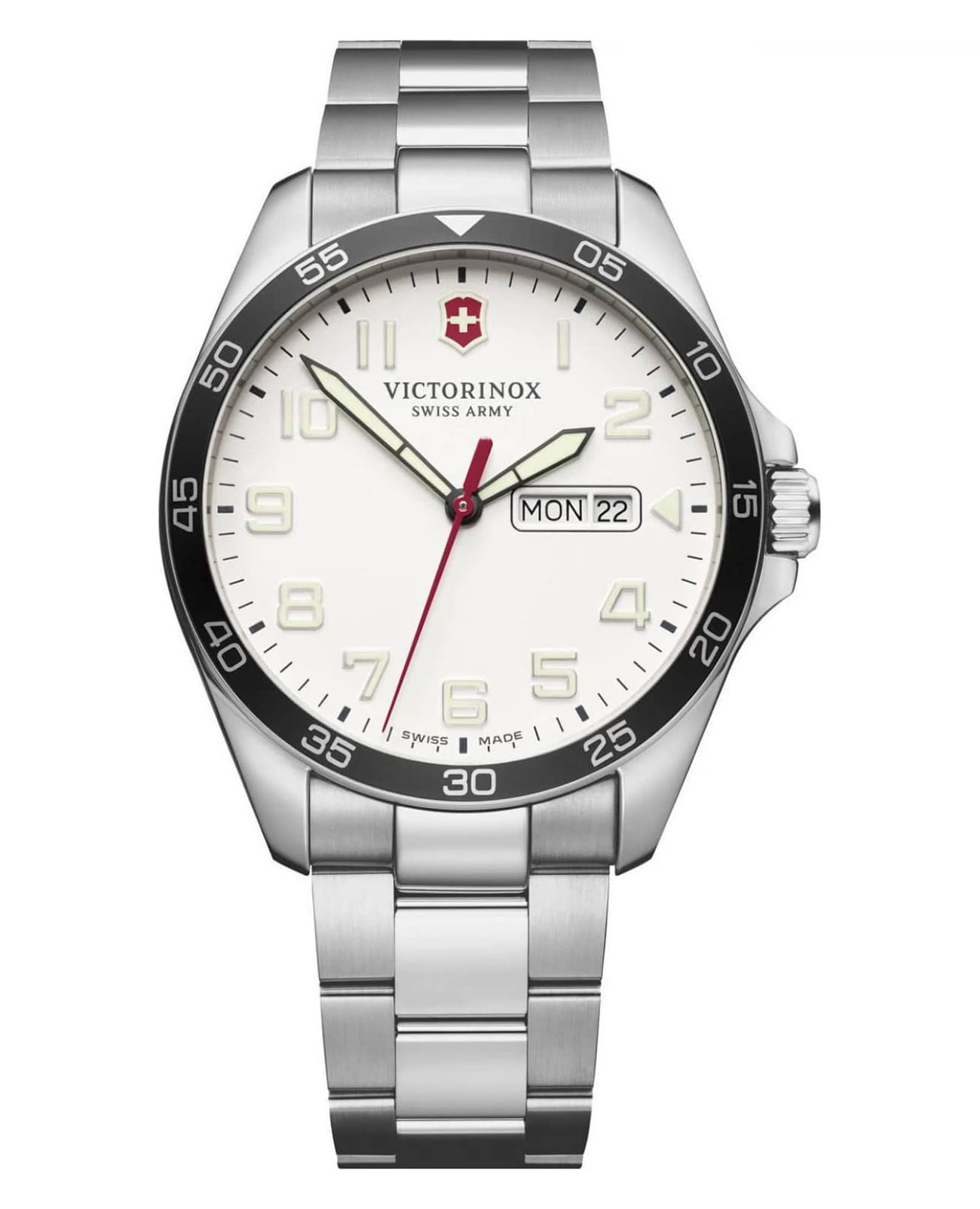 Мужские наручные часы Victorinox 241850 с надежным кварцевым механизмом. Сапфировое стеклоСапфировое стеклоПрочный и надёжный материал из кристалла сапфира синтетического происхождения, характеризующийся особой твёрдостью и устойчивостью к царапинам и повреждениям. с антибликовым покрытием. Степень водозащиты: 100 метров, позволит плавать, нырять и заниматься другими водными видами спорта. Корпус и браслет часов выполнены из нержавеющей стали. Окошки дня недели и даты находятся в положении 3 часа. Стрелки и метки с люминесцентным покрытиемЛюминесцентное покрытиеПозволяет считывать показания времени в темноте. Производители наносят на стрелки, часовые индексы, безель или поверхность циферблата светонакопительный состав, дающий холодное свечение.. Стальной браслет на застёжке-бабочке с кнопкамиЗастёжка "бабочка"Такой вид застёжки дополняется предохранителями, помогающими избежать случайного раскрытия браслета. Обладают изящным исполнением. . БезельБезельВнешний ободок, закрепляющий стекло. В спортивных часах так называется поворотное кольцо с делениями на циферблате, выполняет роль таймера – замеряет отрезки времени на шкале. Неподвижный безель – элемент декора. Однонаправленно вращающийся безель на дайверских часах позволяет фиксировать моменты погружения и выныривания на поверхность. из алюминия с PVD-покрытиемPVDУльтратонкое покрытие наносится в технике вакуумного напыления, сочетает в себе нитрид титана особой прочности со слоем золота или оксида хрома. Несёт в себе декоративную или защитную функцию..