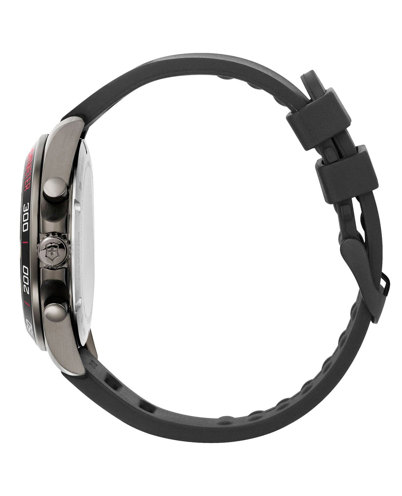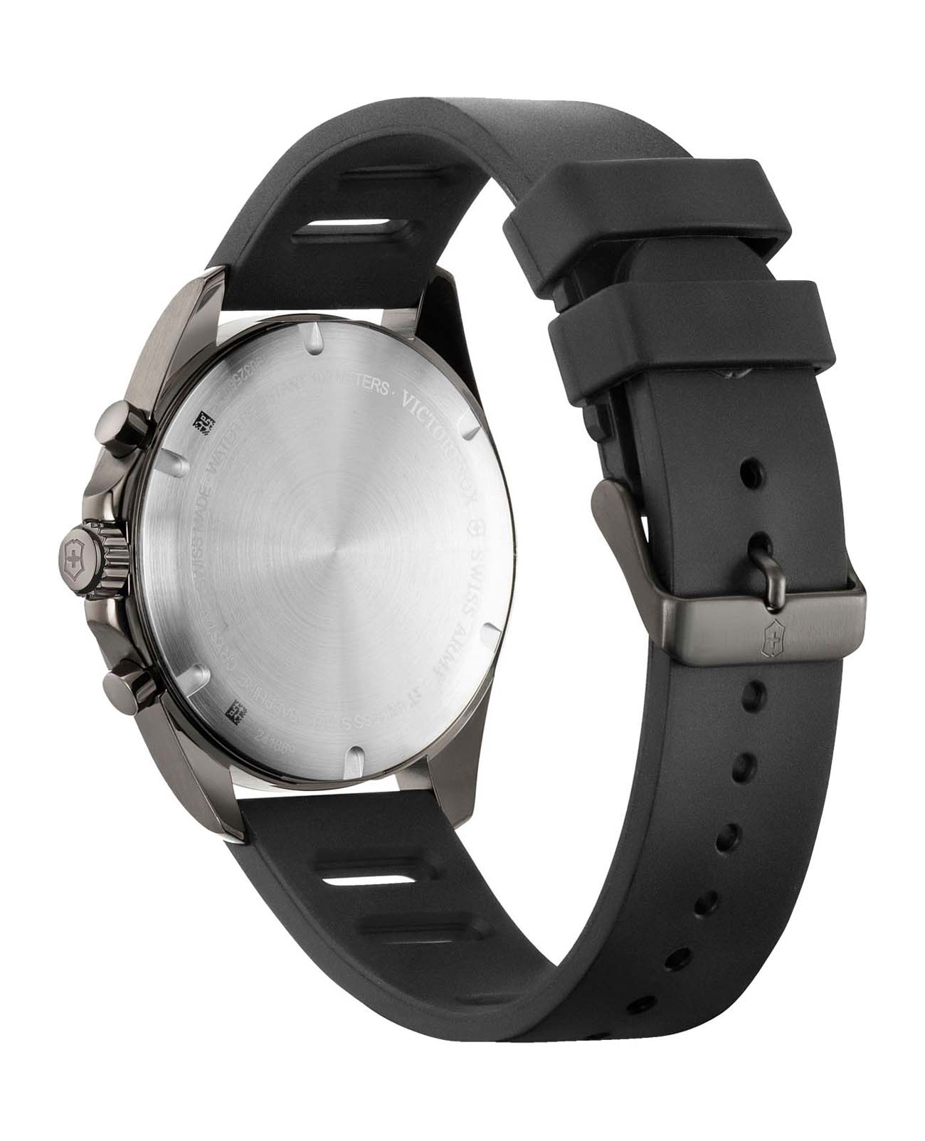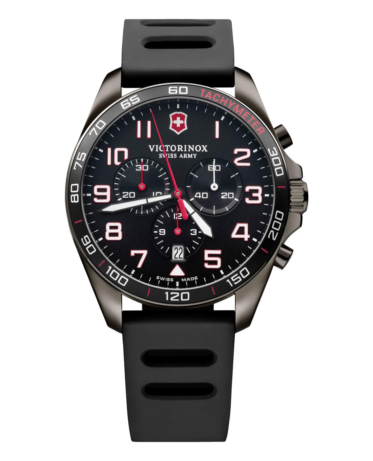 Мужские швейцарские часы-хронографХронографФункция позволяет измерять отрезки времени с особой точностью: часы, минуты, секунды. Верным признаком хронографа является наличие на циферблате 3 дополнительных окошек-счётчиков. Victorinox Fieldforce Sport Chronograph 241889  с надёжным кварцевым механизмом. Сапфировое стеклоСапфировое стеклоПрочный и надёжный материал из кристалла сапфира синтетического происхождения, характеризующийся особой твёрдостью и устойчивостью к царапинам и повреждениям. с трёхслойным антибликовым покрытием. Корпус часов выполнен из нержавеющей стали с PVD-покрытиемPVDУльтратонкое покрытие наносится в технике вакуумного напыления, сочетает в себе нитрид титана особой прочности со слоем золота или оксида хрома. Несёт в себе декоративную или защитную функцию..БезельБезельВнешний ободок, закрепляющий стекло. В спортивных часах так называется поворотное кольцо с делениями на циферблате, выполняет роль таймера – замеряет отрезки времени на шкале. Неподвижный безель – элемент декора. Однонаправленно вращающийся безель на дайверских часах позволяет фиксировать моменты погружения и выныривания на поверхность. с метками тахиметраТахиметрРазмеченная шкала, располагается на ободке или безеле часов. Тахиметр позволяет рассчитать скорость на определённом участке пути, расстояние измеряется в километрах или милях.. Окошко даты находится в положении 6 часов, стрелки и метки с люминесцентным покрытиемЛюминесцентное покрытиеПозволяет считывать показания времени в темноте. Производители наносят на стрелки, часовые индексы, безель или поверхность циферблата светонакопительный состав, дающий холодное свечение.. Класс водозащиты: 100 метров, позволит плавать, нырять и заниматься другими водными видами спорта. Практичный резиновый ремешок на стандартной застёжке.