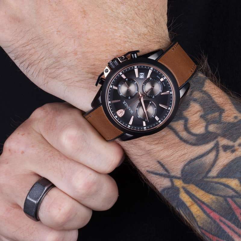 Мужские кварцевые часы-хронографХронографФункция позволяет измерять отрезки времени с особой точностью: часы, минуты, секунды. Верным признаком хронографа является наличие на циферблате 3 дополнительных окошек-счётчиков. с секундомеромСекундомерСекундоме́р — прибор, способный измерять интервалы времени с точностью до долей секунды. Wainer WA.16101-A сочетает элегантный дизайн и высокое качество исполнения. Корпус выполнен из нержавеющей стали с PVD-покрытиемPVDУльтратонкое покрытие наносится в технике вакуумного напыления, сочетает в себе нитрид титана особой прочности со слоем золота или оксида хрома. Несёт в себе декоративную или защитную функцию. черного цвета, диаметром 44 мм и толщиной 11 мм, обеспечивает прочность и долговечность. Циферблат с метками в виде штрихов выполнен по технологии Sunray (солнечные лучи) и украшен фирменным логотипом Wainer. Секундная стрелка на конце декорирована логотипом бренда - буквой W. Сапфировое стеклоСапфировое стеклоПрочный и надёжный материал из кристалла сапфира синтетического происхождения, характеризующийся особой твёрдостью и устойчивостью к царапинам и повреждениям. защищает дисплей от царапин и механических повреждений. Окошко даты находится в положении между отметками 4 и 5 часов. Стрелки с люминесцентным покрытиемЛюминесцентное покрытиеПозволяет считывать показания времени в темноте. Производители наносят на стрелки, часовые индексы, безель или поверхность циферблата светонакопительный состав, дающий холодное свечение., улучшая читаемость в условиях недостаточного освещения. БезельБезельВнешний ободок, закрепляющий стекло. В спортивных часах так называется поворотное кольцо с делениями на циферблате, выполняет роль таймера – замеряет отрезки времени на шкале. Неподвижный безель – элемент декора. Однонаправленно вращающийся безель на дайверских часах позволяет фиксировать моменты погружения и выныривания на поверхность. с PVD-покрытиемPVDУльтратонкое покрытие наносится в технике вакуумного напыления, сочетает в себе нитрид титана особой прочности со слоем золота или оксида хрома. Несёт в себе декоративную или защитную функцию. золотисто-черного цвета. Кожаный ремешок на силиконовой основе и стандартной застёжкой обеспечивает комфортное ношение. Водонепроницаемость до 100 метров делает модель подходящей для плавания и активного образа жизни. Wainer — это стильный и надежный аксессуар для тех, кто ценит швейцарское качество и современные технологии.