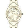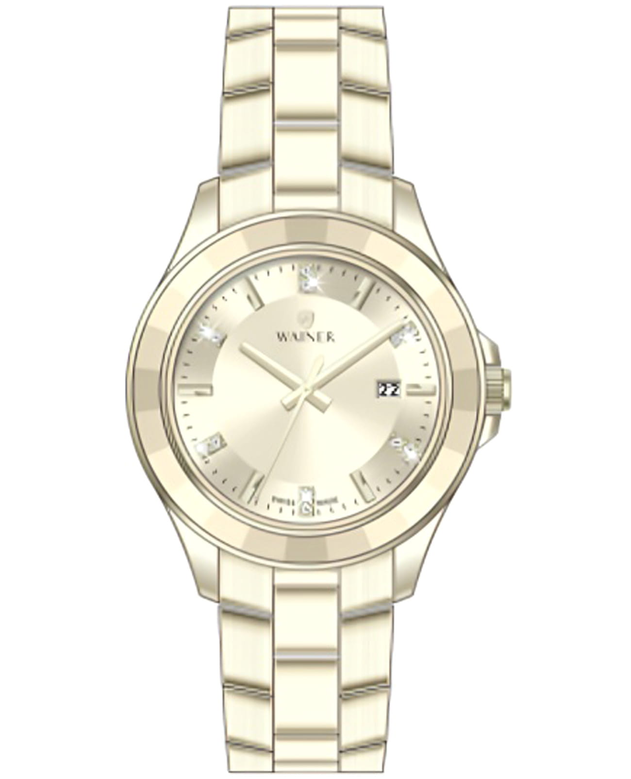 Женские кварцевые часы Wainer WA.18020-F сочетают в себе элегантный дизайн и высокое качество исполнения. Корпус выполнен из гипоаллергенной нержавеющей стали с PVD-покрытиемPVDУльтратонкое покрытие наносится в технике вакуумного напыления, сочетает в себе нитрид титана особой прочности со слоем золота или оксида хрома. Несёт в себе декоративную или защитную функцию. золотистого цвета, диаметром 33 мм и толщиной 8 мм, обеспечивает прочность и долговечность. Циферблат украшен фирменным логотипом Wainer в положении 12 часов и цирконами. Метки в виде штрихов. Минеральное стеклоМинеральное стеклоМинеральное стекло представляет собой искусственно выращенный минерал кварца. Такое стекло отличается особой устойчивостью к повреждениям и царапинам. Уступает по некоторым качествам сапфировому стеклу. с сапфировым напылением защищает дисплей от царапин и механических повреждений. Стальной браслет с PVD-покрытиемPVDУльтратонкое покрытие наносится в технике вакуумного напыления, сочетает в себе нитрид титана особой прочности со слоем золота или оксида хрома. Несёт в себе декоративную или защитную функцию. на застёжке-бабочке с кнопкамиЗастёжка "бабочка"Такой вид застёжки дополняется предохранителями, помогающими избежать случайного раскрытия браслета. Обладают изящным исполнением. обеспечивает комфортное ношение на запястье. Окошко даты находится в положении 3 часа. Водонепроницаемость до 50 метров позволит защитить корпус от случайных брызг или капель дождя. Рифленая заводная головка с защитой. Wainer — это стильный и надежный аксессуар для тех, кто ценит швейцарское качество и современные технологии.