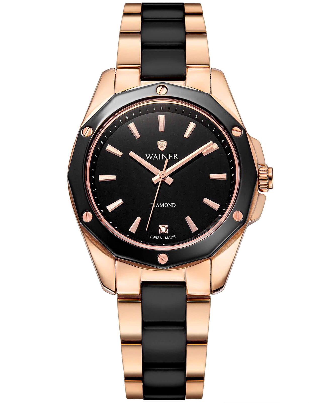 Wainer WA.18050-D – элегантные женские швейцарские часы, сочетающие изысканный стиль и высококачественные материалы. Корпус и браслет выполнен из нержавеющей стали 316L с PVD-покрытиемPVDУльтратонкое покрытие наносится в технике вакуумного напыления, сочетает в себе нитрид титана особой прочности со слоем золота или оксида хрома. Несёт в себе декоративную или защитную функцию., обеспечивающей прочность и долговечность. Сапфировое стеклоСапфировое стеклоПрочный и надёжный материал из кристалла сапфира синтетического происхождения, характеризующийся особой твёрдостью и устойчивостью к царапинам и повреждениям. с кристально чистым покрытием защищает циферблат от царапин и гарантирует идеальную прозрачность. БезельБезельВнешний ободок, закрепляющий стекло. В спортивных часах так называется поворотное кольцо с делениями на циферблате, выполняет роль таймера – замеряет отрезки времени на шкале. Неподвижный безель – элемент декора. Однонаправленно вращающийся безель на дайверских часах позволяет фиксировать моменты погружения и выныривания на поверхность. с PVD-покрытиемPVDУльтратонкое покрытие наносится в технике вакуумного напыления, сочетает в себе нитрид титана особой прочности со слоем золота или оксида хрома. Несёт в себе декоративную или защитную функцию.. Водонепроницаемость 50 метров делает модель подходящей для повседневного ношения и лёгких водных активностей.
