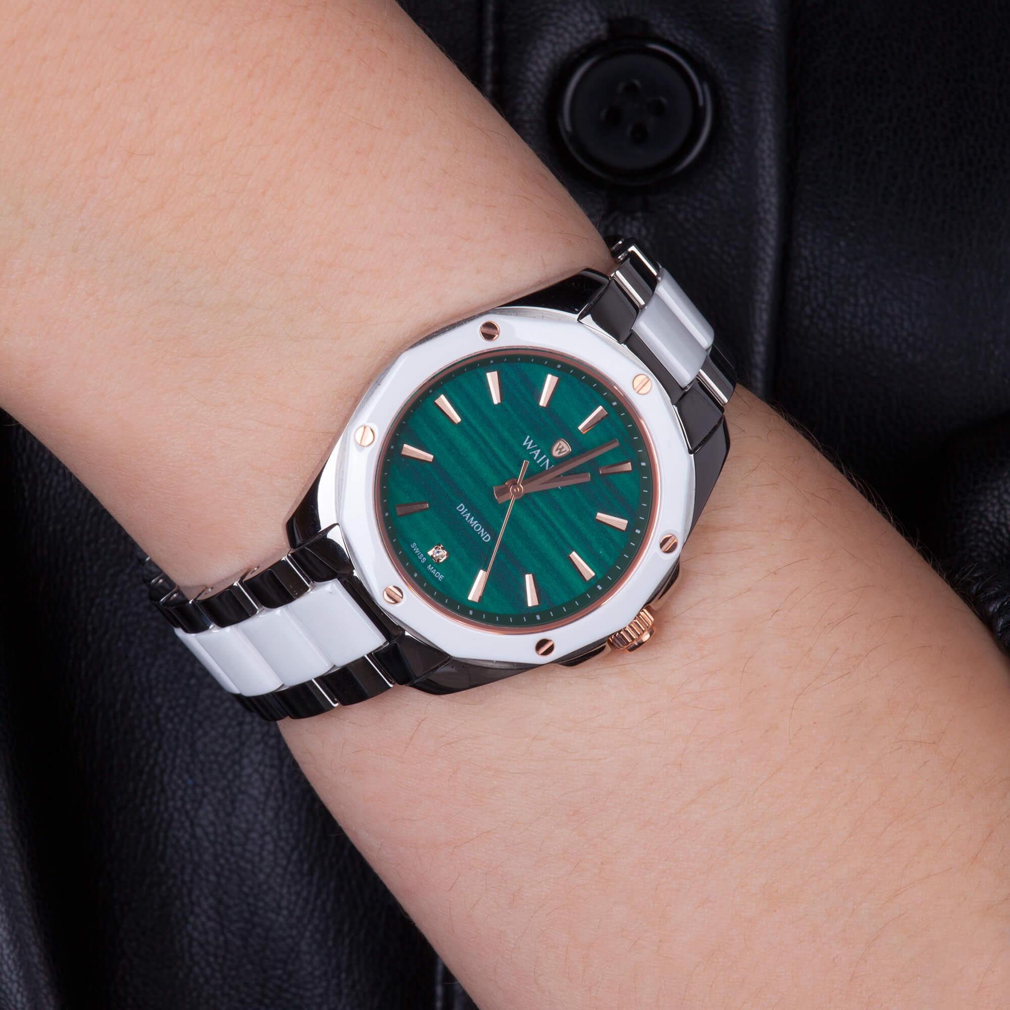 Wainer WA.18050-E – элегантные женские швейцарские часы, сочетающие изысканный стиль и высококачественные материалы. Корпус выполнен из нержавеющей стали 316L, обеспечивающей прочность и долговечность. Сапфировое стеклоСапфировое стеклоПрочный и надёжный материал из кристалла сапфира синтетического происхождения, характеризующийся особой твёрдостью и устойчивостью к царапинам и повреждениям. с кристально чистым покрытием защищает циферблат от царапин и гарантирует идеальную прозрачность. БезельБезельВнешний ободок, закрепляющий стекло. В спортивных часах так называется поворотное кольцо с делениями на циферблате, выполняет роль таймера – замеряет отрезки времени на шкале. Неподвижный безель – элемент декора. Однонаправленно вращающийся безель на дайверских часах позволяет фиксировать моменты погружения и выныривания на поверхность. с PVD-покрытиемPVDУльтратонкое покрытие наносится в технике вакуумного напыления, сочетает в себе нитрид титана особой прочности со слоем золота или оксида хрома. Несёт в себе декоративную или защитную функцию.. Водонепроницаемость 50 метров делает модель подходящей для повседневного ношения и лёгких водных активностей.