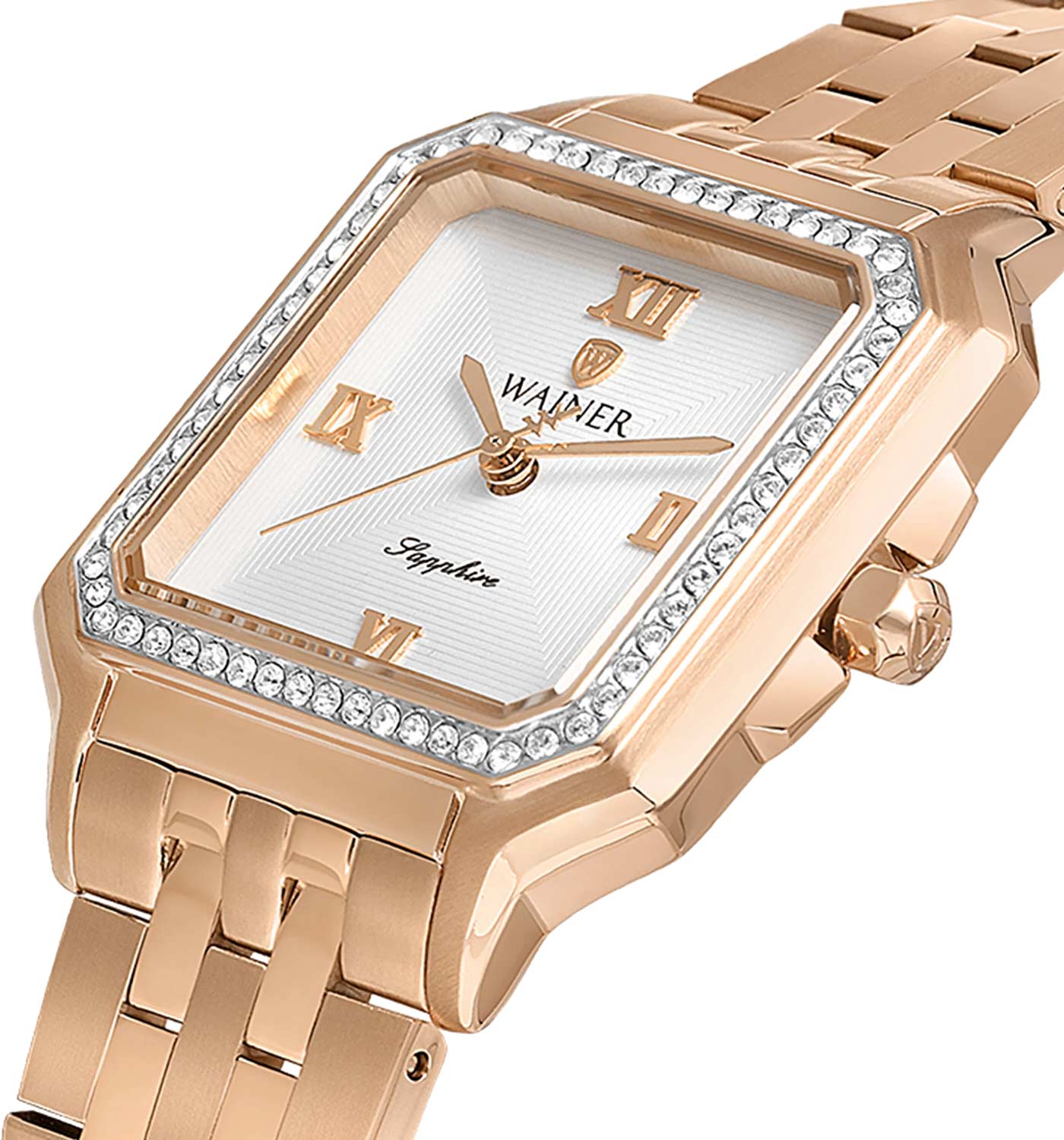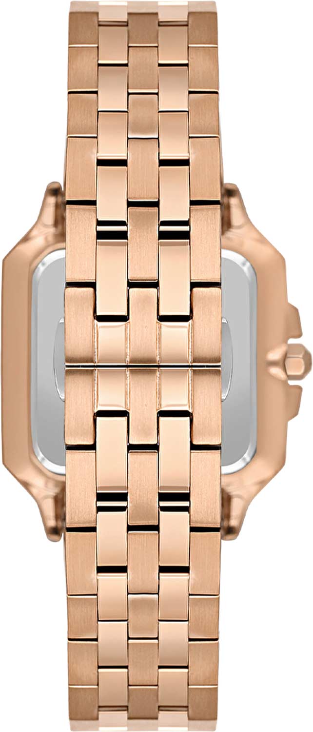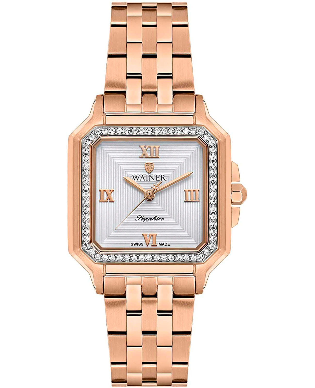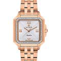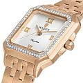 Женские кварцевые часы Wainer WA.18080-D — это изысканный аксессуар, воплощающий швейцарское качество и элегантность. Модель выполнена в квадратной форме из стали 316L с PVD-покрытиемPVDУльтратонкое покрытие наносится в технике вакуумного напыления, сочетает в себе нитрид титана особой прочности со слоем золота или оксида хрома. Несёт в себе декоративную или защитную функцию. розового цвета, что придаёт ей благородный внешний вид и устойчивость к царапинам. Корпус украшен люминесцентным покрытиемЛюминесцентное покрытиеПозволяет считывать показания времени в темноте. Производители наносят на стрелки, часовые индексы, безель или поверхность циферблата светонакопительный состав, дающий холодное свечение. и инкрустирован кристаллами, подчёркивая внимание к деталям. Циферблат серебристого цвета гильоширован и дополнен римскими цифрами, а секундная стрелка на конце декорирована буквой W, подчёркивая индивидуальность модели. Защиту механизма обеспечивает сапфировое стеклоСапфировое стеклоПрочный и надёжный материал из кристалла сапфира синтетического происхождения, характеризующийся особой твёрдостью и устойчивостью к царапинам и повреждениям., устойчивое к повреждениям. Гранёная заводная головка с защитой оснащена фирменным логотипом, добавляя модели стильности. Браслет из стали 316L с розовым PVD-покрытиемPVDУльтратонкое покрытие наносится в технике вакуумного напыления, сочетает в себе нитрид титана особой прочности со слоем золота или оксида хрома. Несёт в себе декоративную или защитную функцию. шириной 16 мм оснащён Раскладная застёжкаРаскладная застёжкаТакой тип застёжки используется только на браслетах из металла. Она никогда не раскрывается полностью, происходит разделение на 2 и более частей. Раскладывающая застёжка снизит вероятность потери часов к минимуму., обеспечивающей комфорт и надёжную фиксацию на запястье. Водонепроницаемость позволяет использовать модель при мытье рук или под лёгким дождём. Механизм калибра Ronda 763 гарантирует точность хода и надёжность. Эти часы станут универсальным аксессуаром для тех, кто ценит сочетание стиля, функциональности и швейцарского мастерства — идеальный выбор для повседневной носки и торжественных случаев.