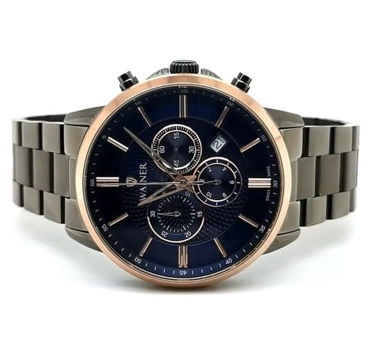 Модель Wainer WA.19515-E сочетает швейцарскую точность, стильный дизайн и функциональность. Корпус диаметром 44 мм выполнен из нержавеющей стали 316L с черным PVD-покрытиемPVDУльтратонкое покрытие наносится в технике вакуумного напыления, сочетает в себе нитрид титана особой прочности со слоем золота или оксида хрома. Несёт в себе декоративную или защитную функцию., придающим часам элегантный и современный вид. Циферблат оформлен в динамичном стиле и оснащен хронографомХронографФункция позволяет измерять отрезки времени с особой точностью: часы, минуты, секунды. Верным признаком хронографа является наличие на циферблате 3 дополнительных окошек-счётчиков. для точного измерения времени, а сапфировое стеклоСапфировое стеклоПрочный и надёжный материал из кристалла сапфира синтетического происхождения, характеризующийся особой твёрдостью и устойчивостью к царапинам и повреждениям. защищает дисплей от царапин и механических повреждений. Часы работают на надежном кварцевом механизме Ronda RL-5030.D, обеспечивающем стабильную точность. Браслет из нержавеющей стали с черным PVD-покрытиемPVDУльтратонкое покрытие наносится в технике вакуумного напыления, сочетает в себе нитрид титана особой прочности со слоем золота или оксида хрома. Несёт в себе декоративную или защитную функцию. и бабочковой застёжкойЗастёжка "бабочка"Такой вид застёжки дополняется предохранителями, помогающими избежать случайного раскрытия браслета. Обладают изящным исполнением. гарантирует надежную фиксацию и комфортное ношение. Водонепроницаемость до 50 метров защищает часы от случайных брызг и дождя. Wainer WA.19515-E — это стильный аксессуар для мужчин, ценящих швейцарское качество, современные технологии и утонченный дизайн.